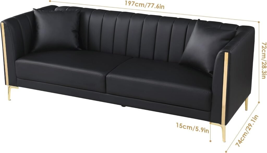 FOTOSOK 78” Couch Sofa, Black Couches for Living Room, Comfy Sofas Faux Leather Sofa 3 Seater Couches with 2 Throw Pillows and Gold Metal Legs, Deep Seat Sofas for Home, Office (Black)