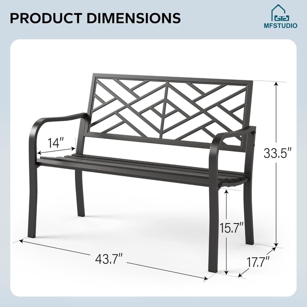 MFSTUDIO 43.7 Inches Outdoor Garden Bench, Cast Iron Metal Frame Patio Park Outside Benches with Geometric Pattern Backrest for Front Porch, Black