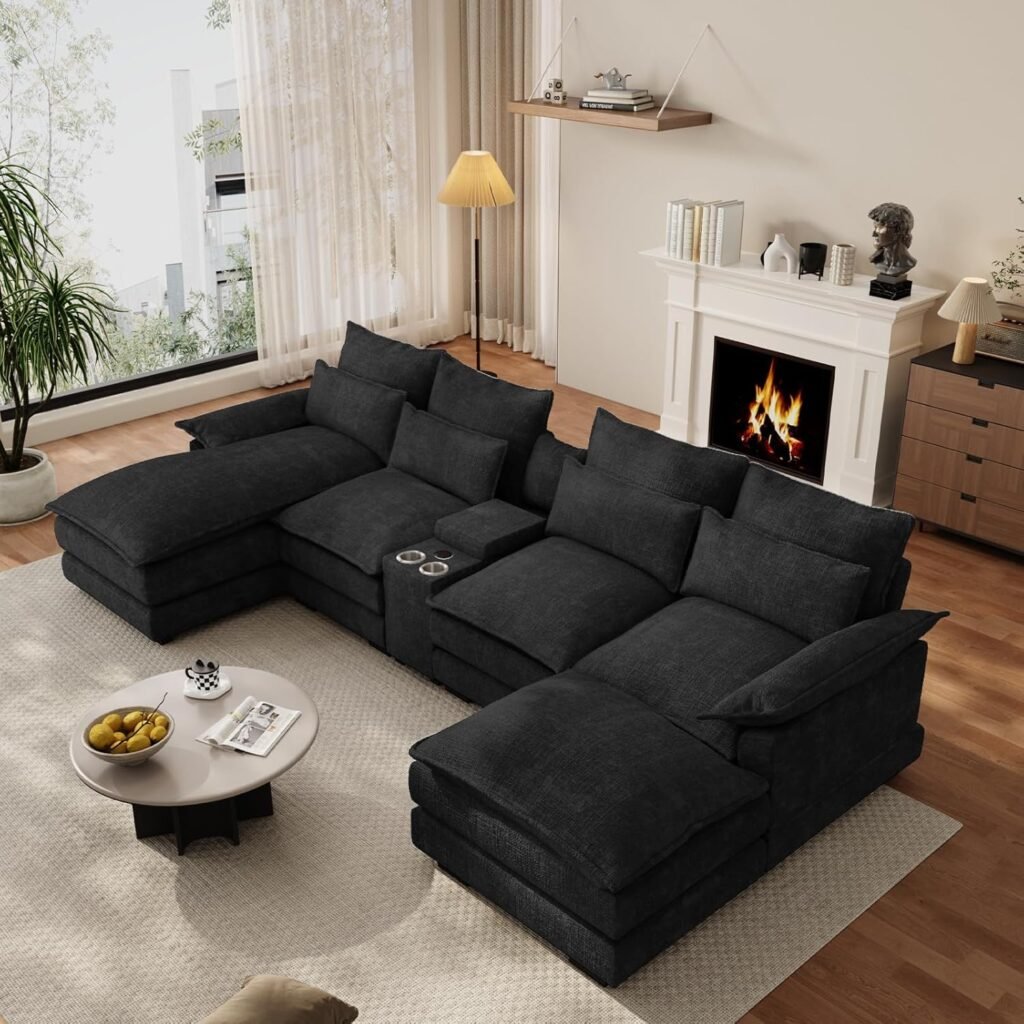 OUYESSIR 135″ U Shaped Sectional Cloud Couch,Black Sectional Couches for Living Room,Comfy Fluffy Chenille Oversized Cloud Couch,Modular Sectional Sofa with Central Console & Double Chaise Lounge