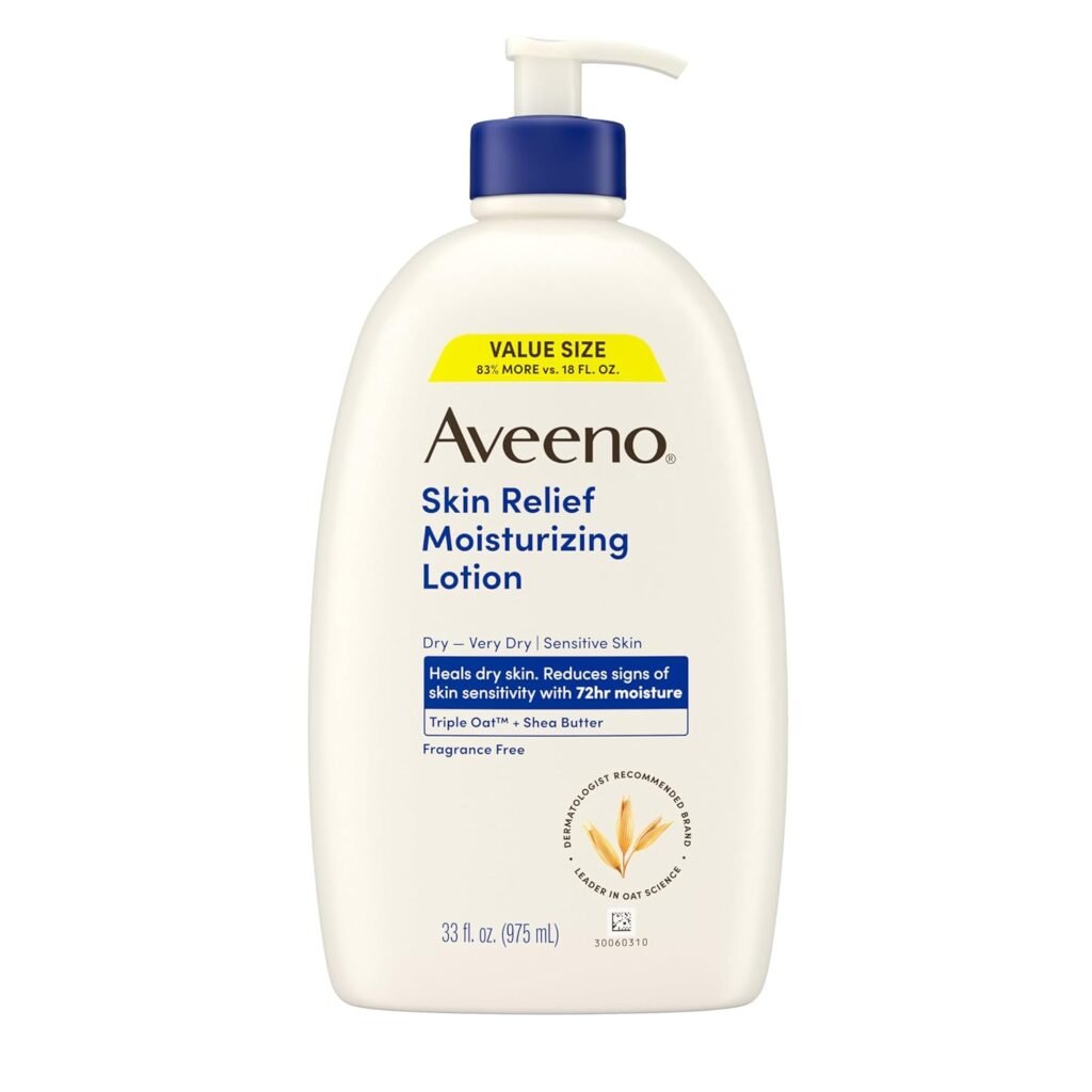 Aveeno Skin Relief Moisturizing Lotion Heals Very Dry, Sensitive Skin, Fast-Absorbing Body Lotion with Triple Oat & Shea Butter, Fragrance Free, Non-Comedogenic, Value Size, 33 fl. oz