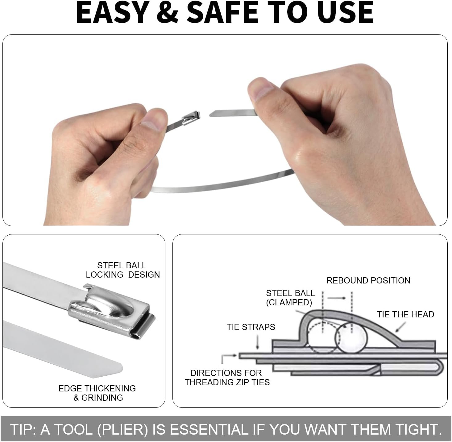 A little extra work to secure them The best for our intense sun in Tucson that will degrade plastic quickly. They are not as secure as the normal zip ties. You have to bend the tail so it can't pull back through and loosen. There's a good video on YouTube with someone installing a muffler part who demonstrates using an angled pair of needle nose pliers. I was able to make that work after seeing the video.