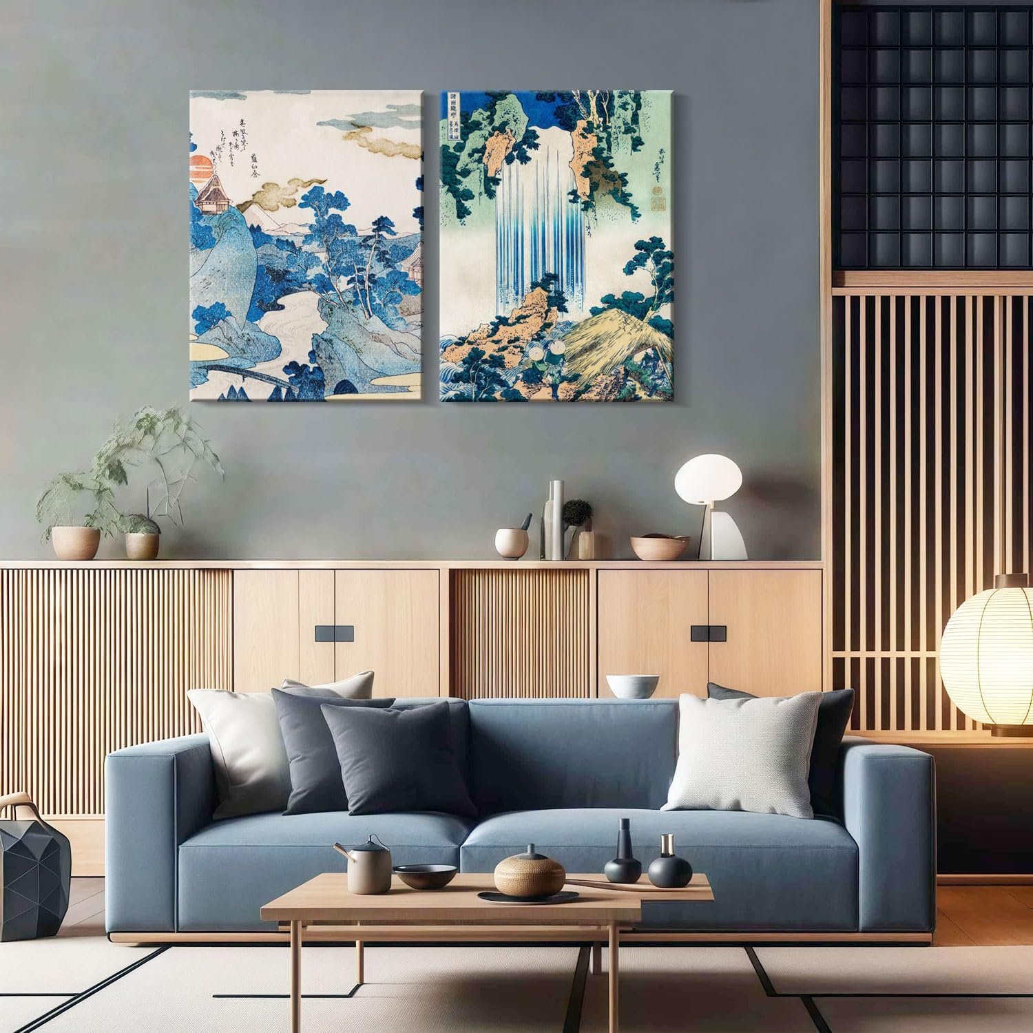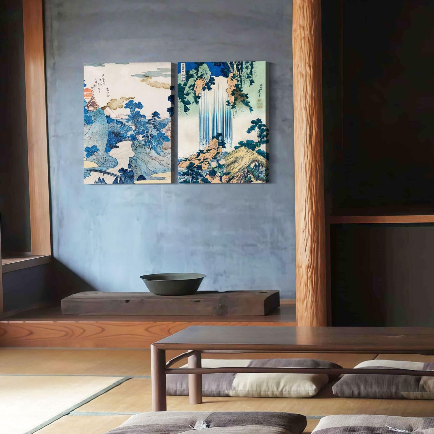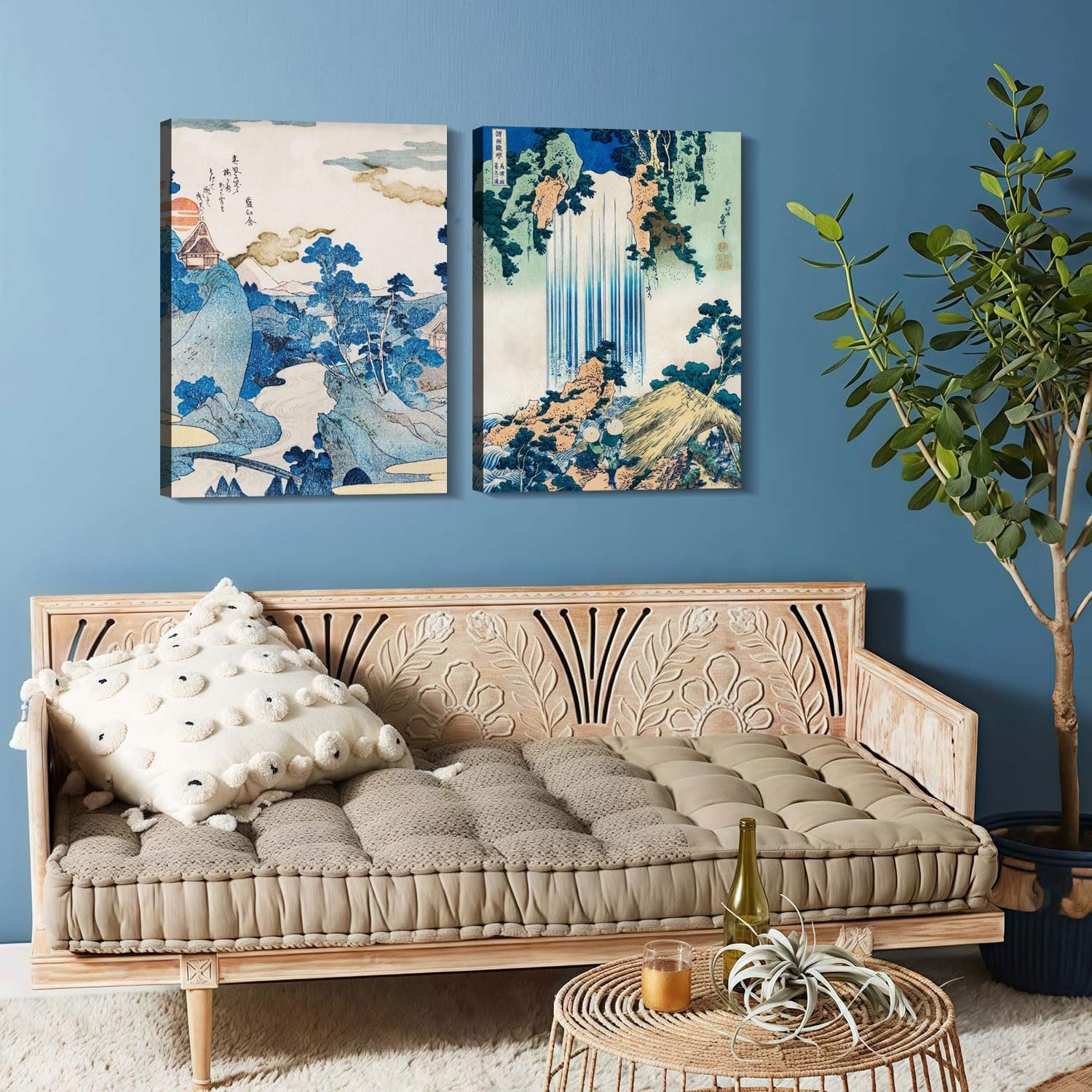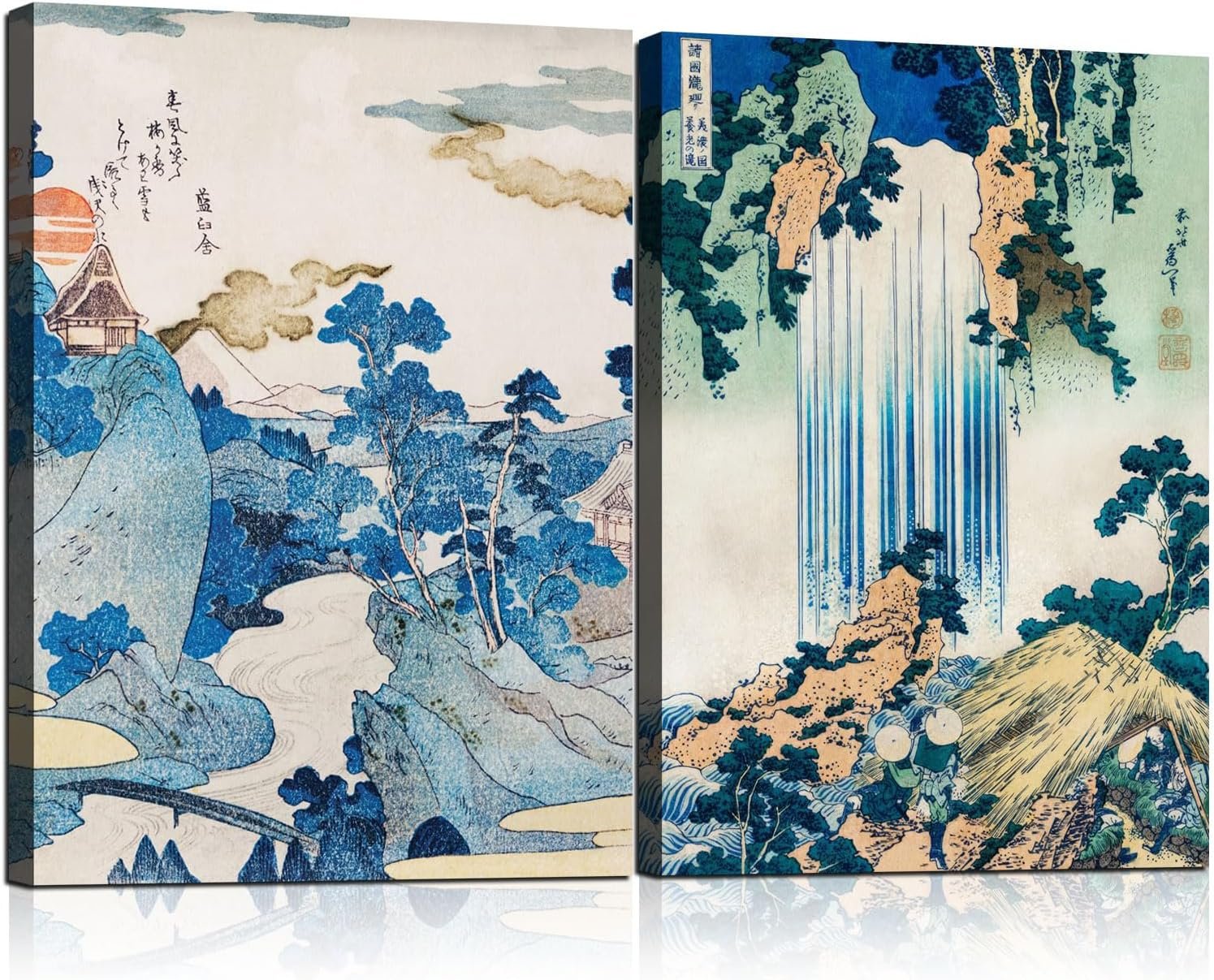 Authentic Ukiyo-e Style Art:This set of 2 wall art pieces features traditional Japanese woodblock-inspired designs, showcasing serene landscapes and flowing waterfalls. A timeless addition to any room seeking cultural depth and visual elegance.