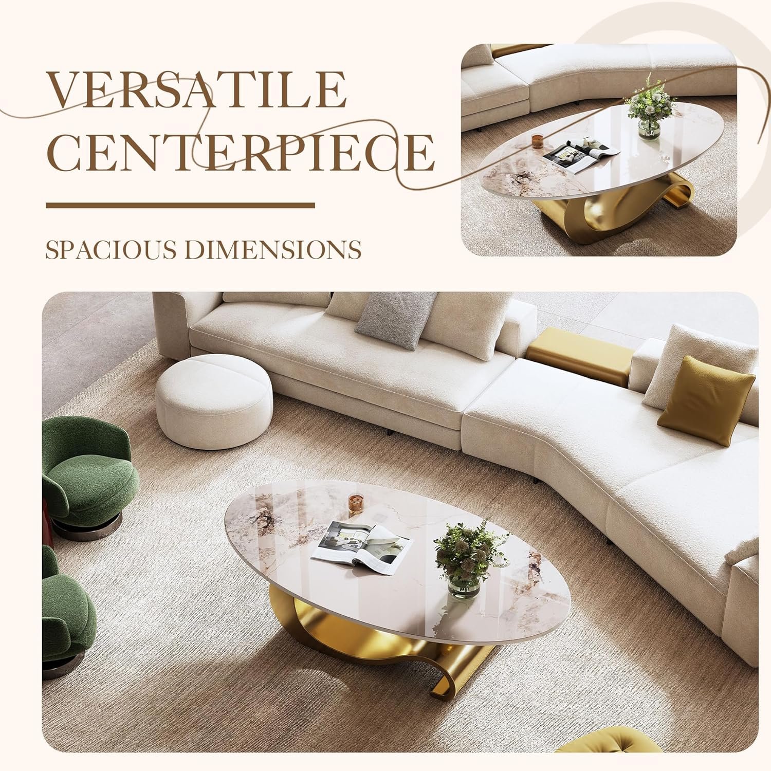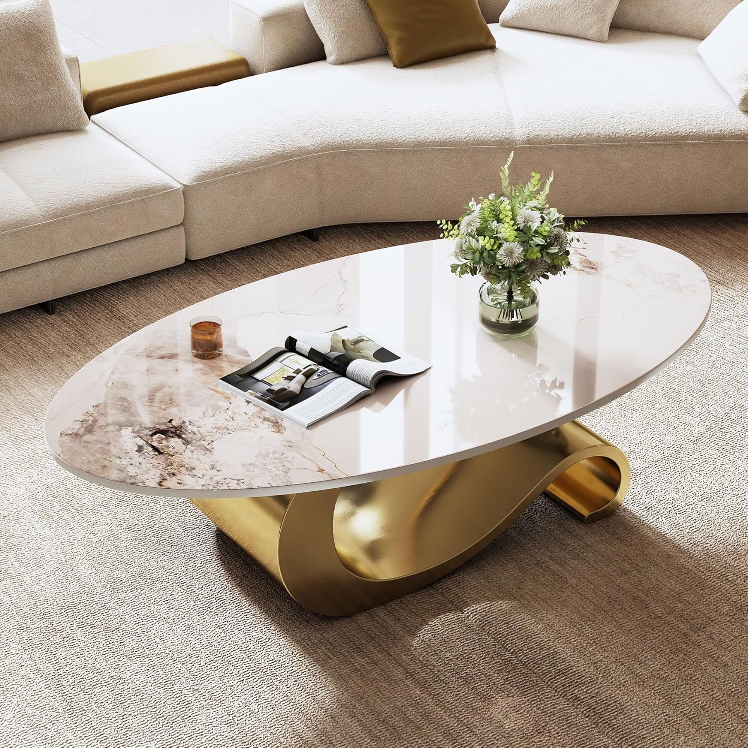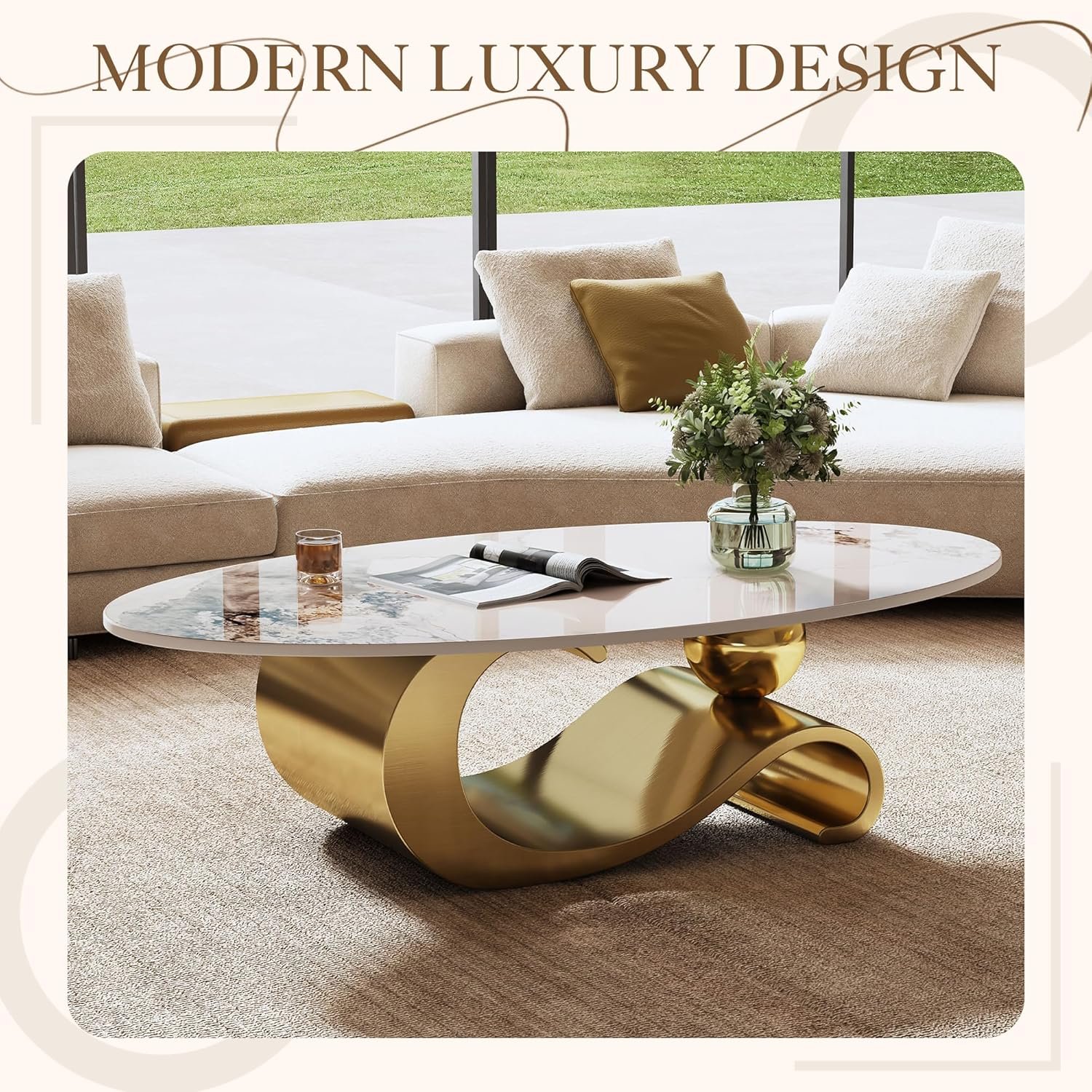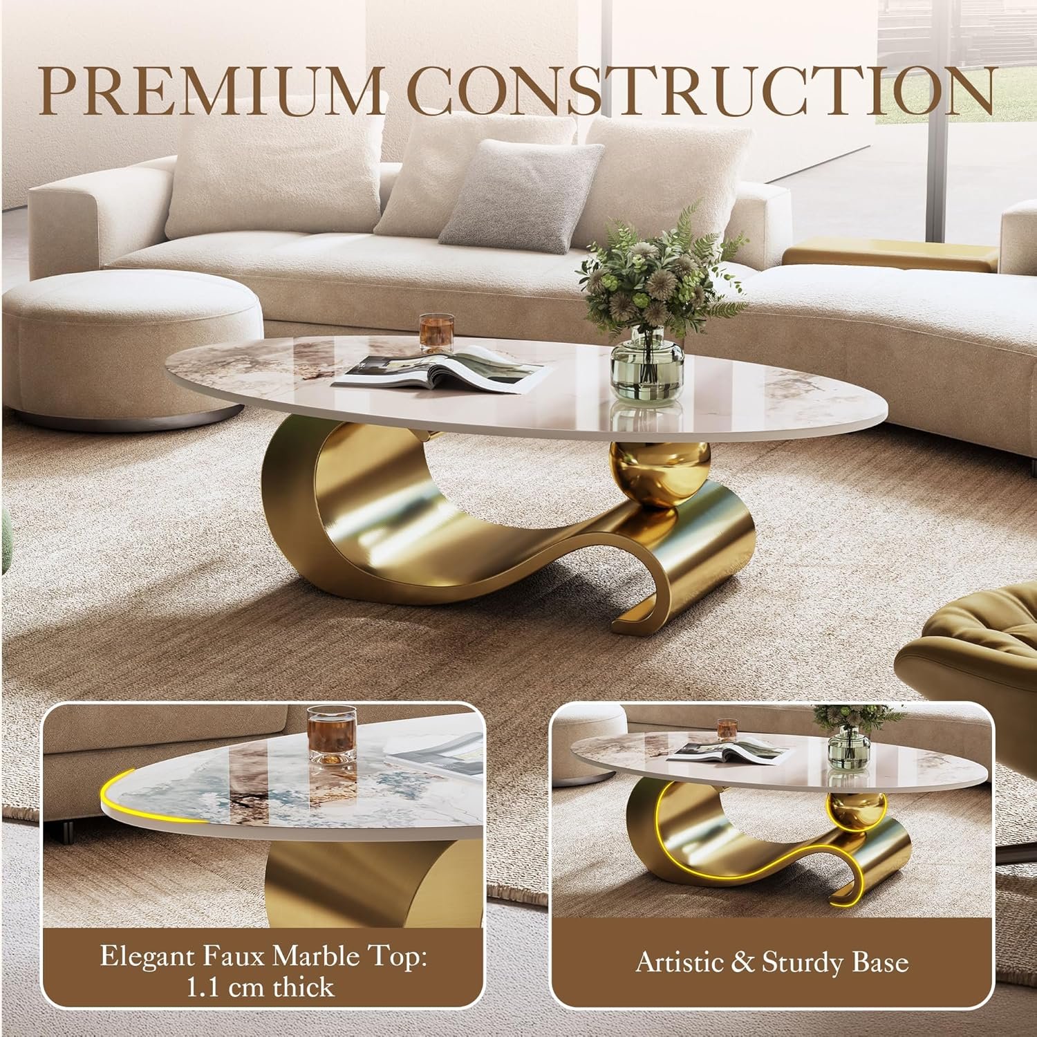 【Modern Luxury Design】Elegant oval coffee table features a sleek faux marble top paired with a sturdy stainless steel base, available in modern silver or luxurious gold finish for a sophisticated high-end look.