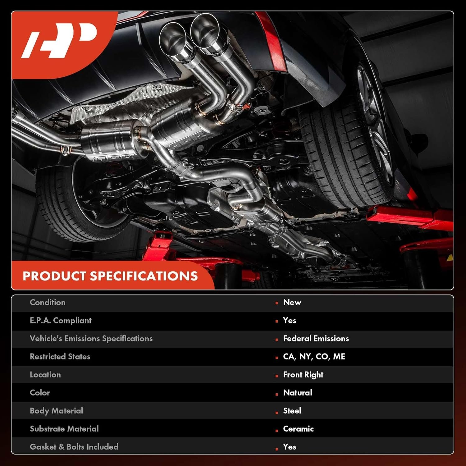 [Specification]: ① E.P.A. Compliant: Yes; ② Vehicle’s Emissions Specifications: Federal Emissions; ③ Restricted States: CA, NY, CO, ME; ④ Position: Front Right; ⑤ Body Material: Stainless Steel; ⑥ Exhaust Manifold Included: Yes; ⑦ Mounting Hardware Included: Yes