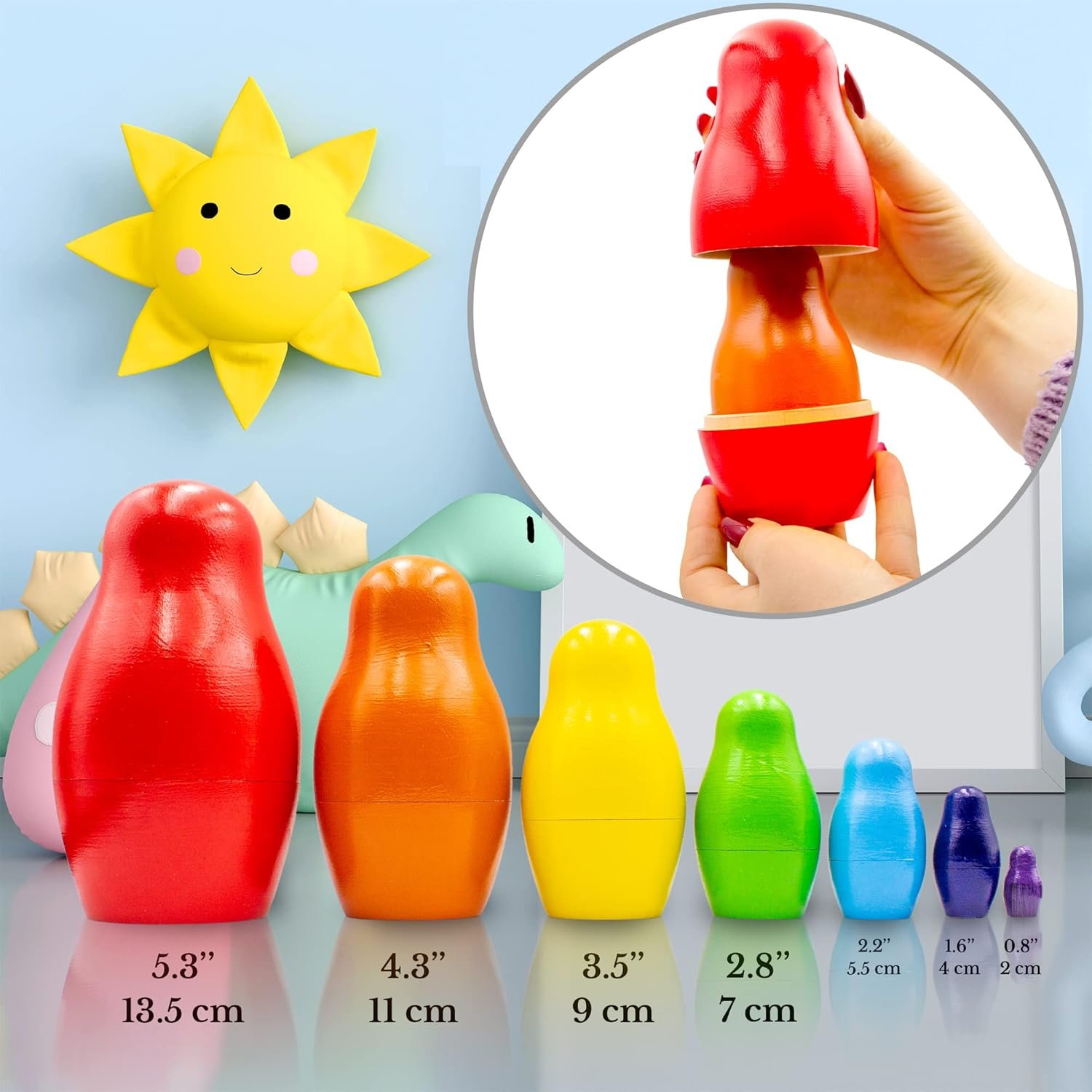 Nesting dolls wooden set includes 7 pcs;The largest doll is 5.3″, the smallest is 0.8″