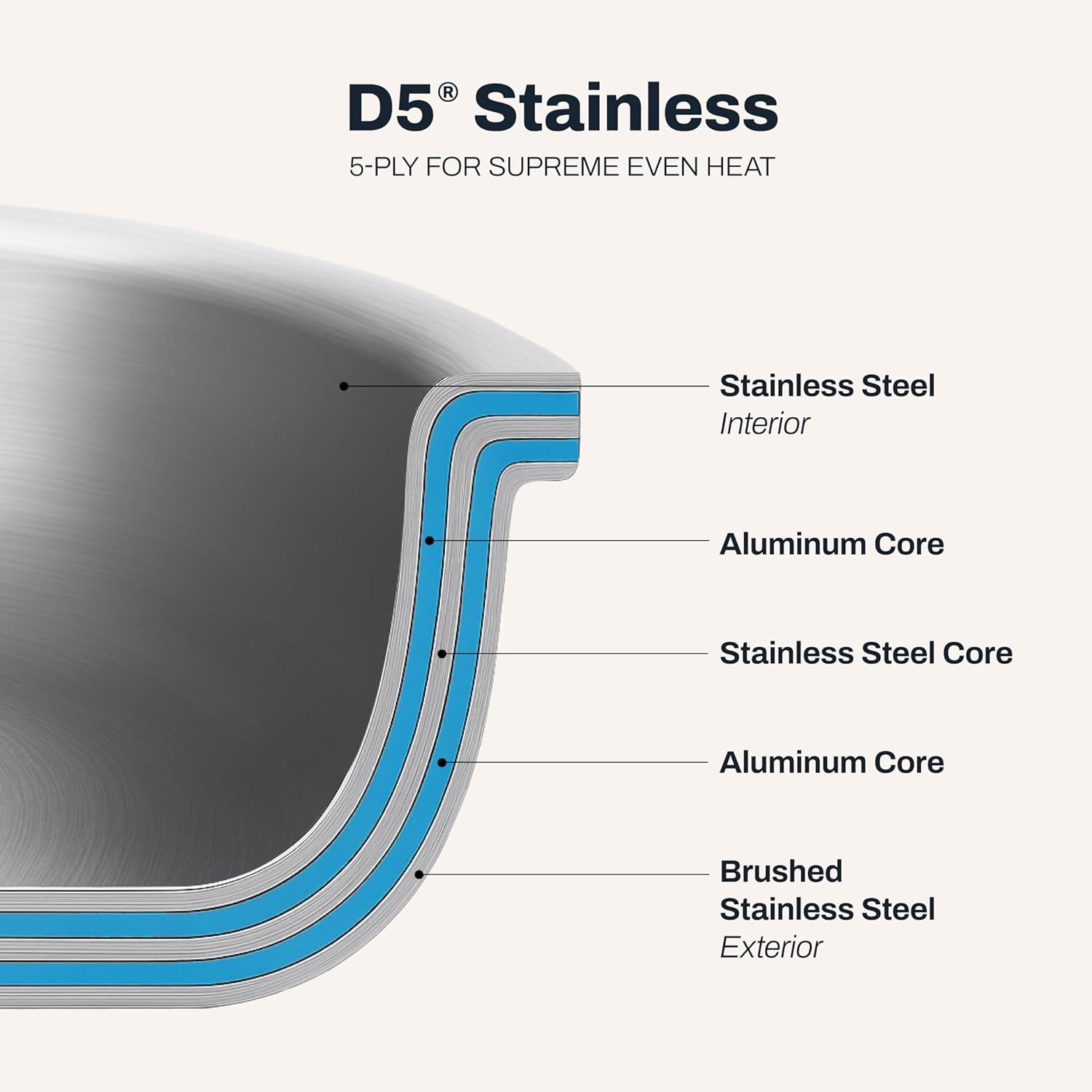 5-ply bonded construction with alternating layers of stainless steel and aluminum for warp-free durability and supremely even heating that eliminates hotspots