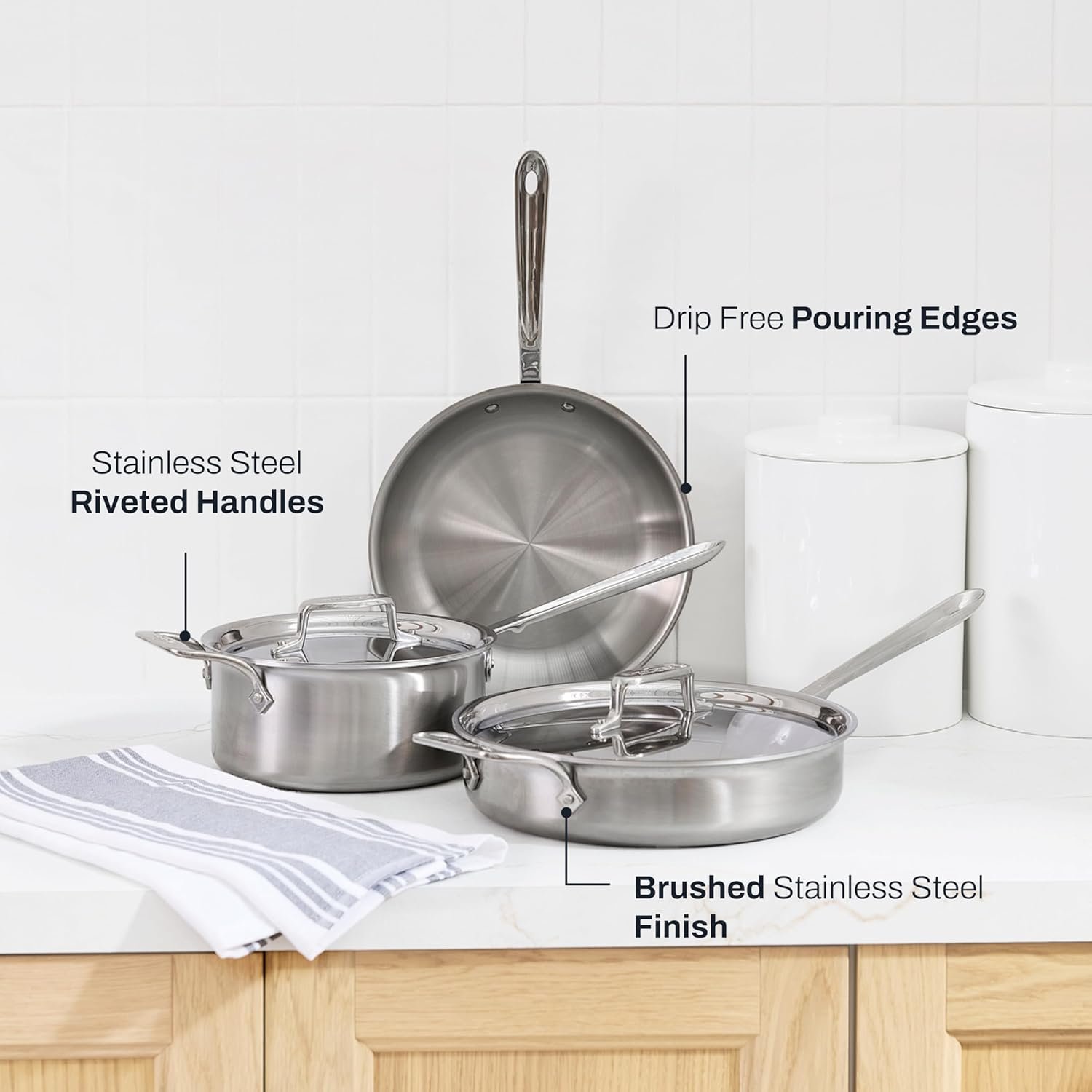 Heat-resistant stainless-steel handles, designed a comfortable grip and permanently secured with stainless-steel rivets, and flared rims for drip-free pouring