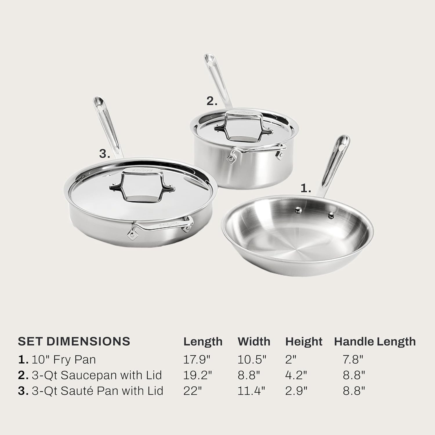 Set includes: 10-inch fry pan, 3-quart sauce pan with lid, 3-quart saute pan with lid
