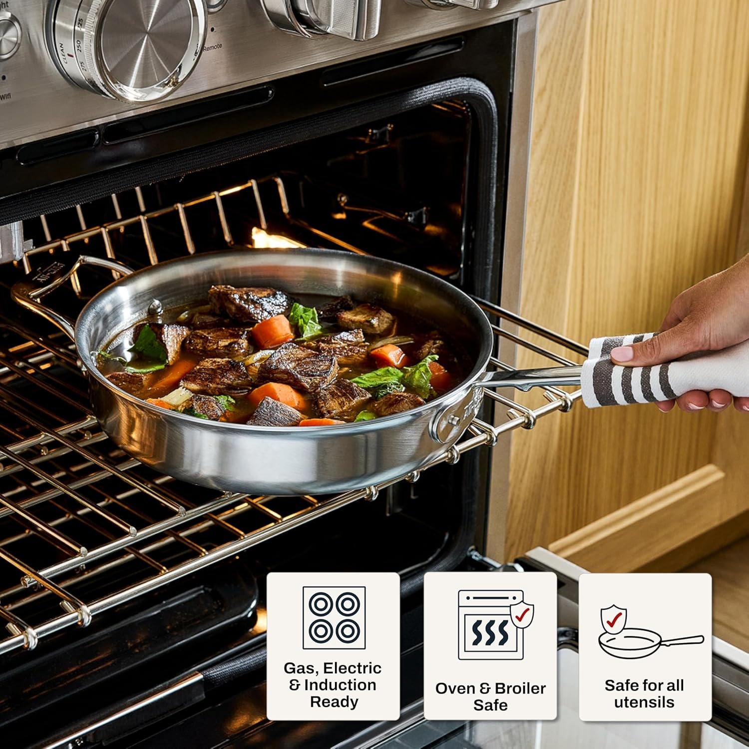 Compatible with all cooktops and optimized performance for induction tops – also oven and broiler-safe up to 600°F