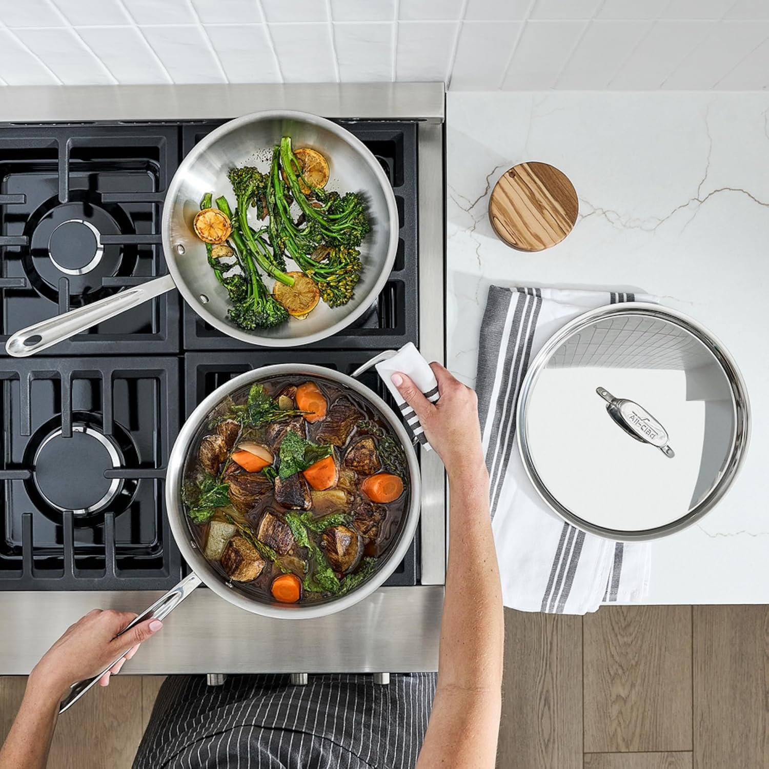 The D5 Cookware Collection is made using a patented 5-ply construction that takes your cooking to the next level. is made with our patented process that bonds 3 layers of stainless steel with 2 layers of aluminum. The additional layers distribute heat more evenly and slowly, eliminating hotspots and making every bite identically delicious. This comprehensive cookware set includes 10-inch Fry Pan, 3-quart Sauce Pan with lid, 3-quart Saute Pan with lid. As versatile as it is beautiful, you can use this high-quality stainless steel cookware on gas, electric, or induction ranges or even the oven or broiler. To keep your All-Clad looking brand new, we recommend washing your cookware with a soap and sponge instead of the dishwasher. Bonded, Engineered, & Assembled in USA. Backed by All-Clad’s Limited Lifetime Warranty.