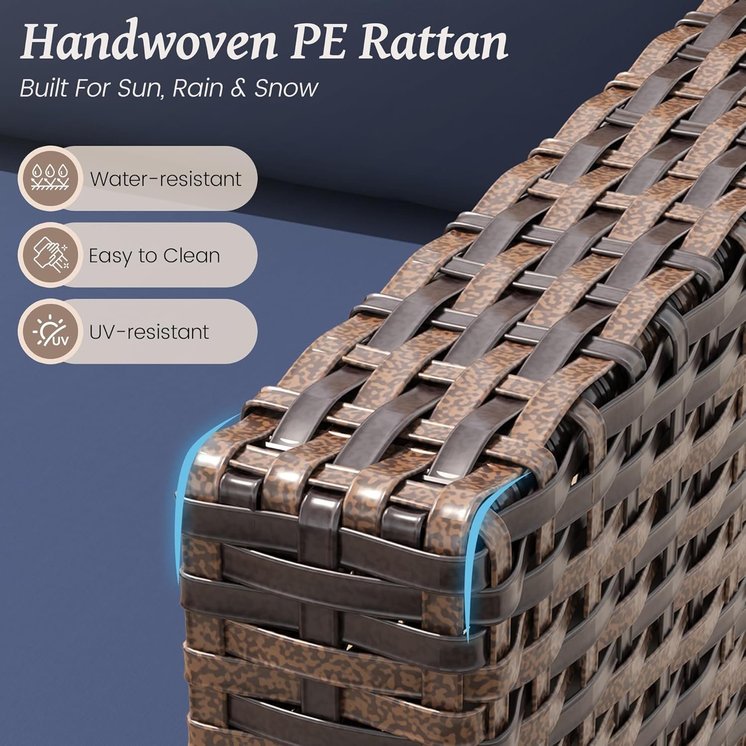 【THICKENED CUSHION & NON-SLIP】This patio furniture set offers a super comfortable seating experience. Thickened seat cushions(4.3 inches) with high resilience sponge and bottom anti-slip dotted plastic fabric, the cushions with smooth zipper is machine washable so that you can zip it off and start a quick wash to have them looking brand new.