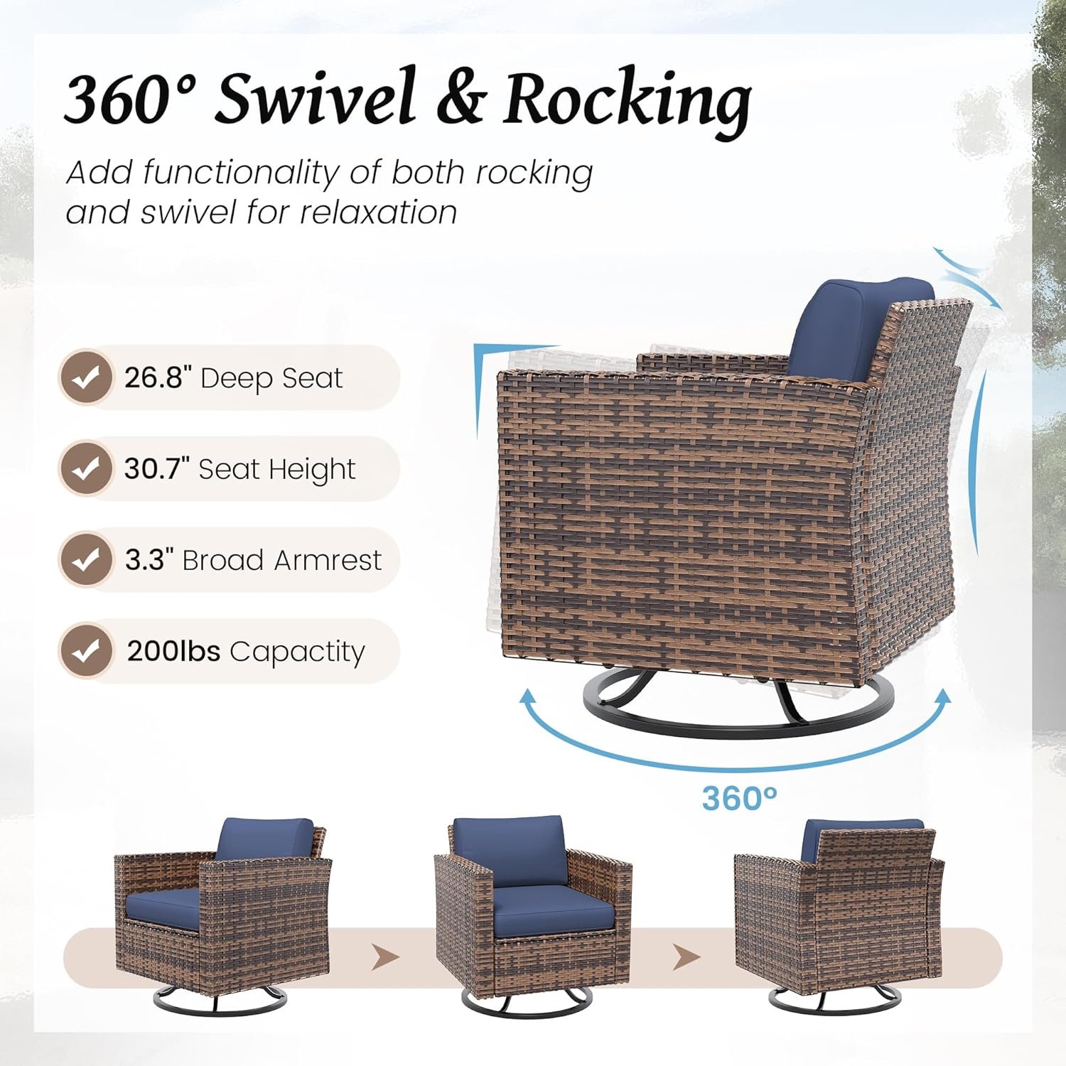 【360° PATIO SWIVEL CHAIRS】The frame made of FSC-certified wood, This swivel chair can not only rotate 360°, but also gently swing back and forth, Ergonomic design curved armrests and special curved back design brings you a really comfortable relax time when seat on this outdoor furniture. Amopatio outdoor furniture will spend more quality time with you.