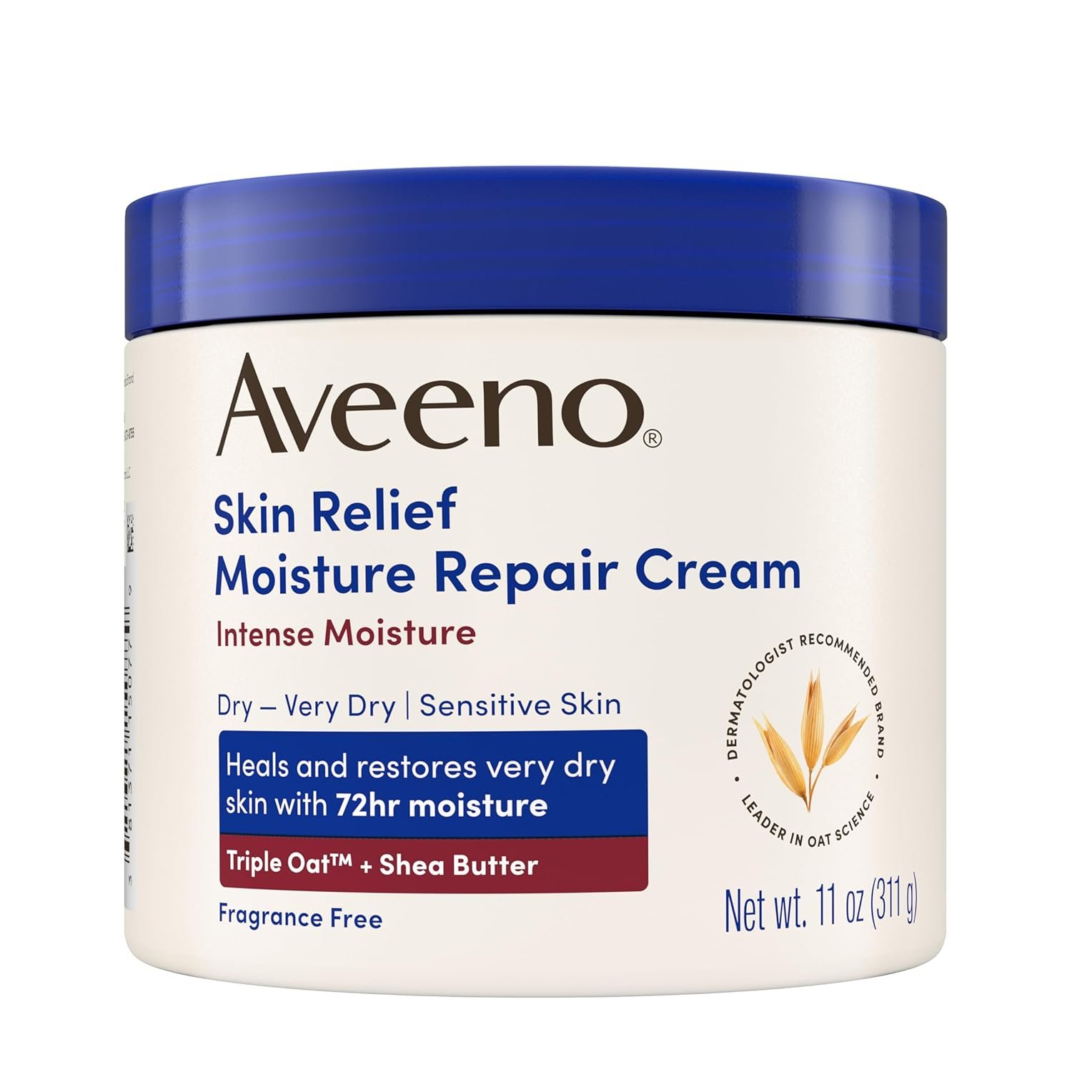 11-ounces of Aveeno Skin Relief Moisture Repair Body Cream with a Triple Oat and Shea Butter helps relieve and restore extra dry skin. This rich, fragrance-free formula goes beyond the moisture barrier to soothe dry skin within the surface layers