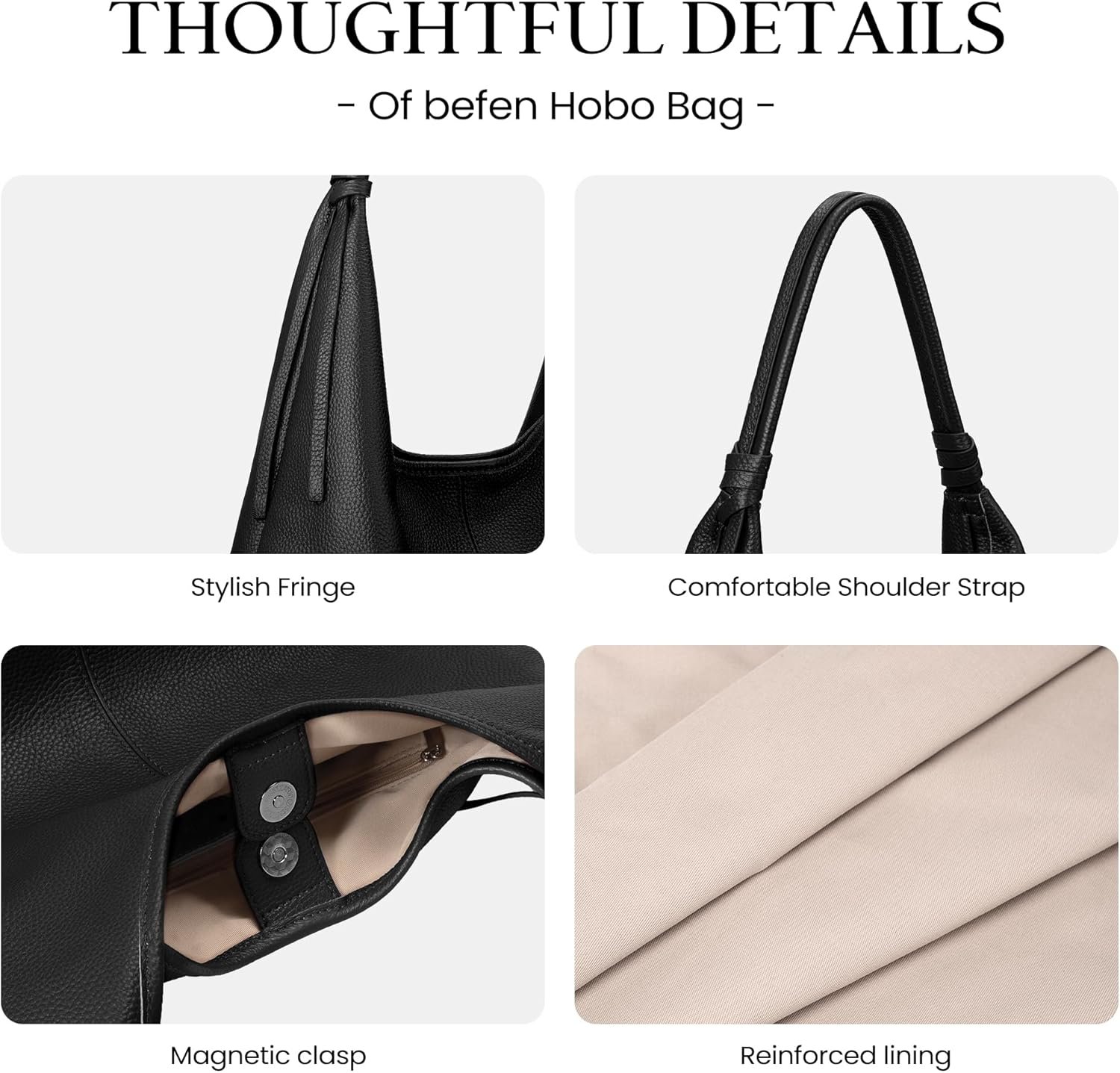 Beautiful bag This befen genuine leather hobo bag is a beautiful blend of style, comfort, and practicality. The bag feels soft to the touch while remaining durable enough for everyday use, and the modern slouchy silhouette with a chic tassel detail pairs effortlessly with a wide range of outfits. It offers a surprisingly spacious interior that easily fits a lightweight laptop, notebook, and daily essentials, all neatly organized with multiple pockets and a handy interior ring for keys. Stylish yet functional, this hobo bag makes an excellent companion for commuting, shopping, or casual outings.