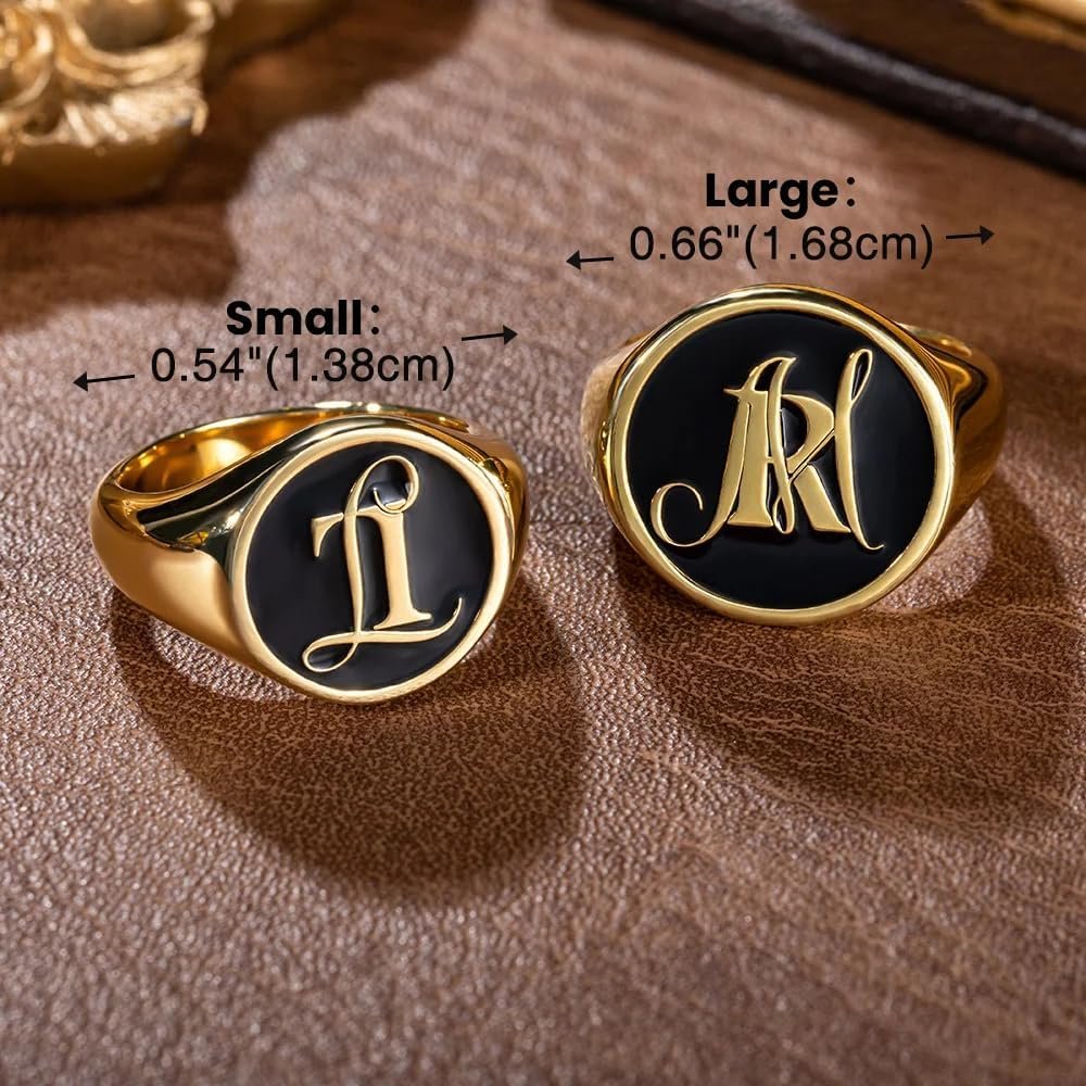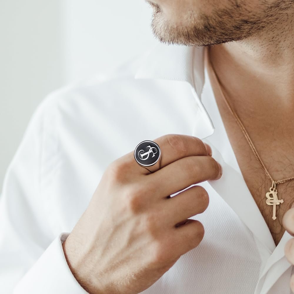 Mens signet ring with initials Between ordering my ring and receiving the ring, everything was perfect. Very nicely made! Although I ordered the wrong size it is still an exceptional piece of work...