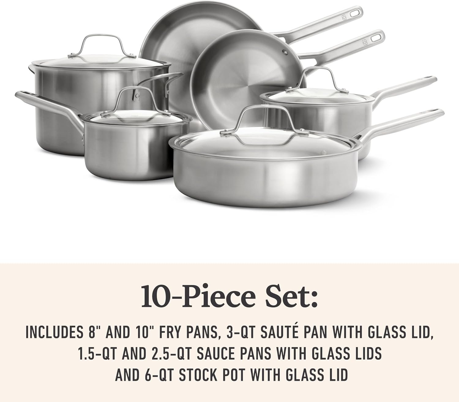 8" and 10" fry pans, 3-qt sauté pan with glass lid, 1.5-qt and 2.5-qt sauce pans with glass lids, and 6-qt stock pot with glass lid |