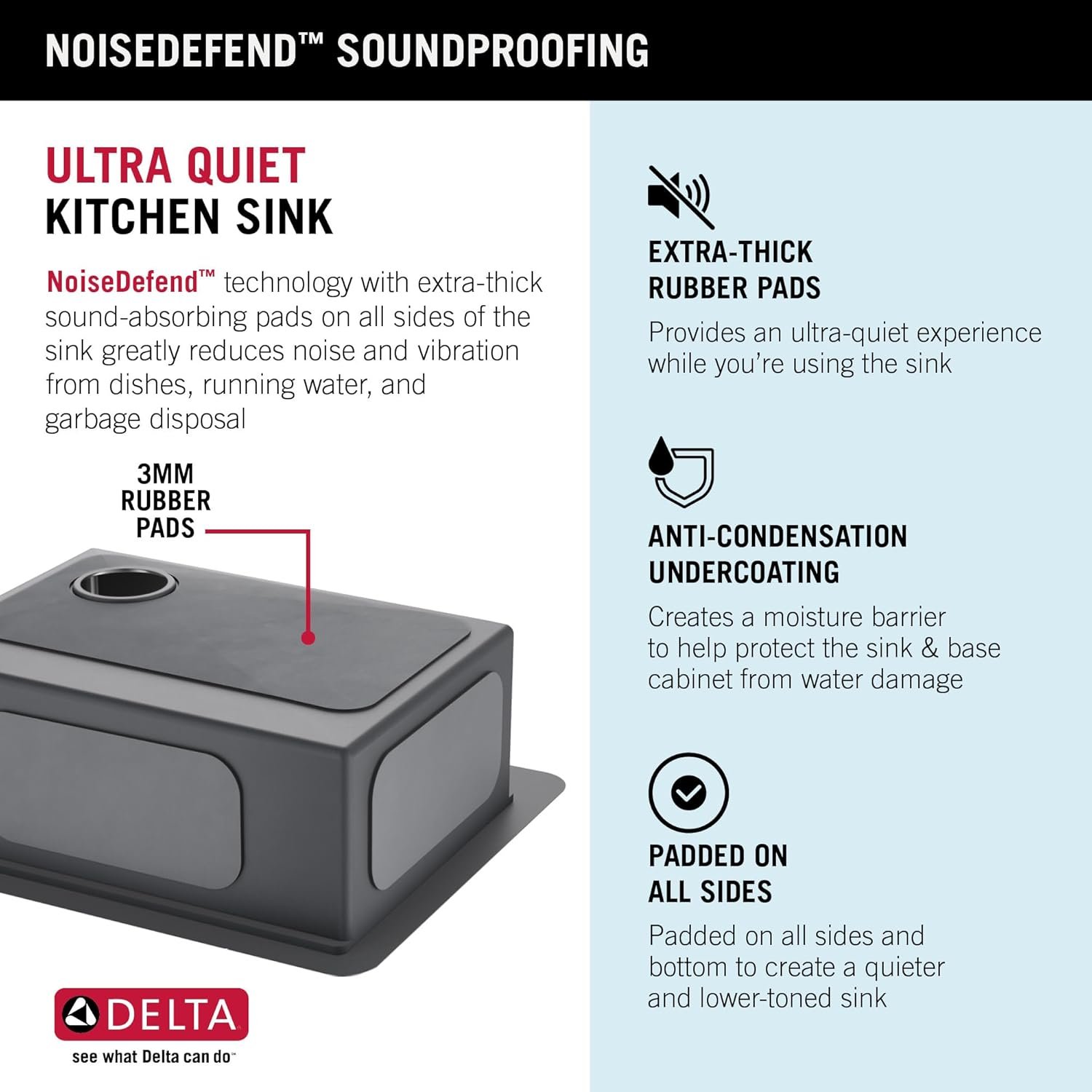 SPACIOUS SINGLE BOWL provides generous space for washing large items while containing mess and splatter inside the sink – REAR-OFFSET DRAIN offers MORE STORAGE underneath the sink – DROP-IN DESIGN with 4mm mounting deck with beveled edge allows for easy top mount installation with any countertop material – NOISEDEFEND SOUNDPROOFING with extra-thick sound-absorbing pads on all sides of the sink greatly reduces noise and vibration – ANTI-CONDENSATION UNDERCOATING helps prevent moisture build-up to reduce the risk of water damage to your cabinets