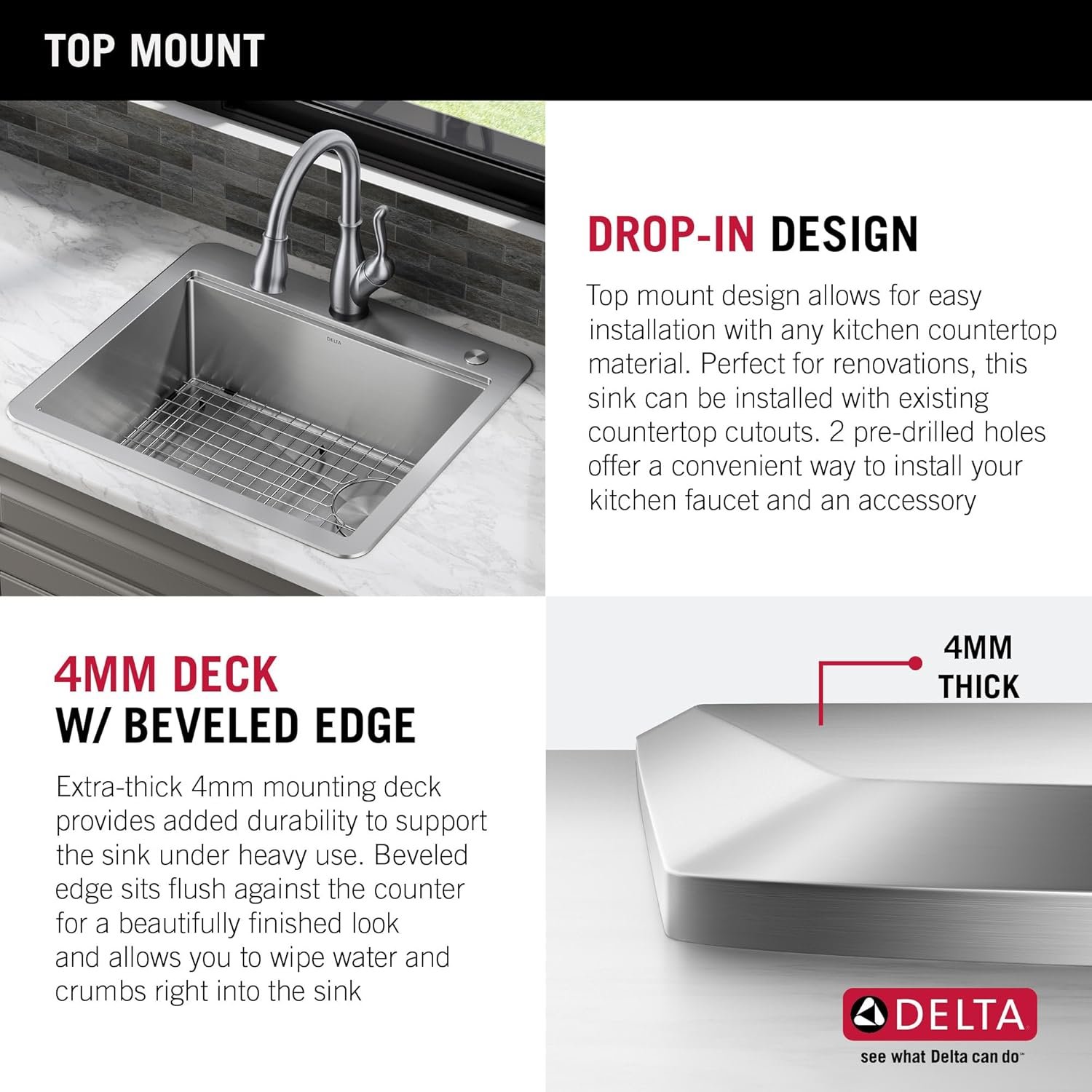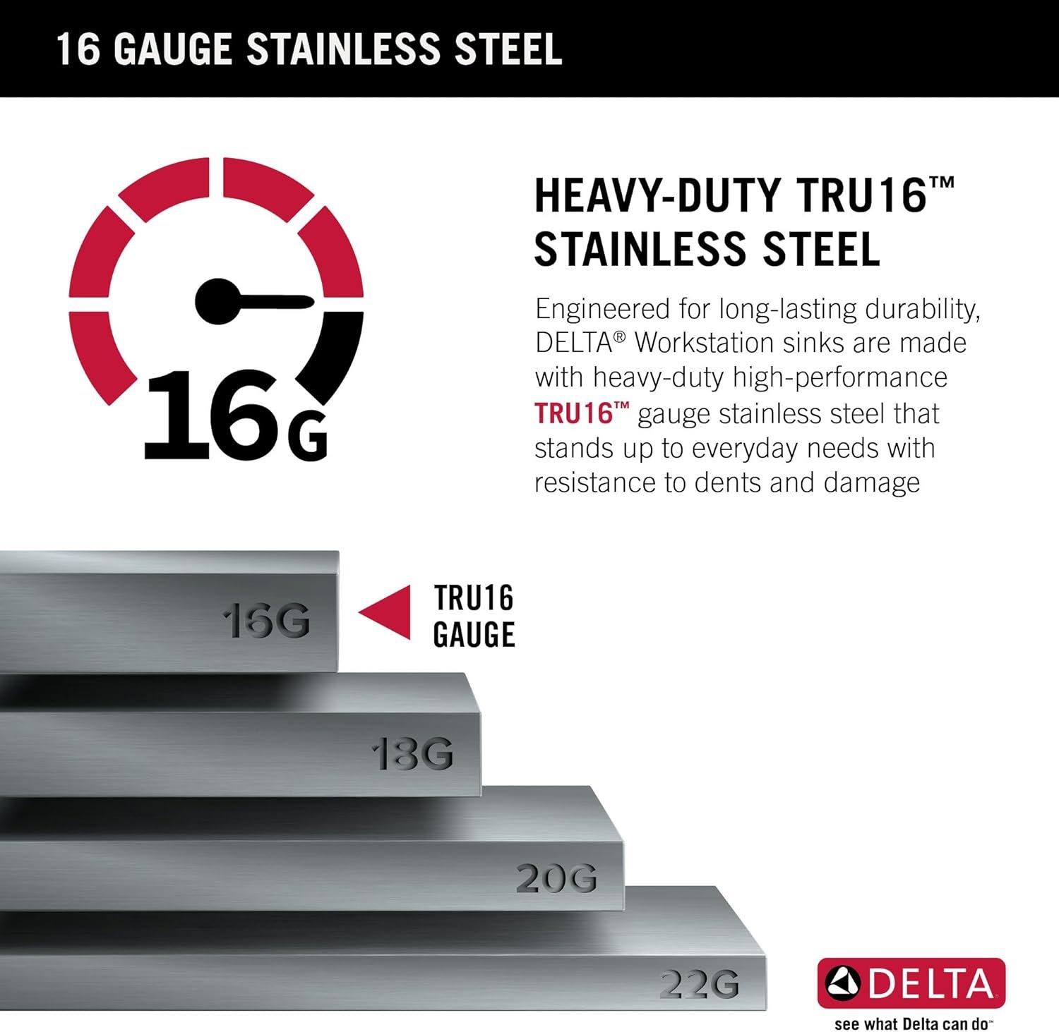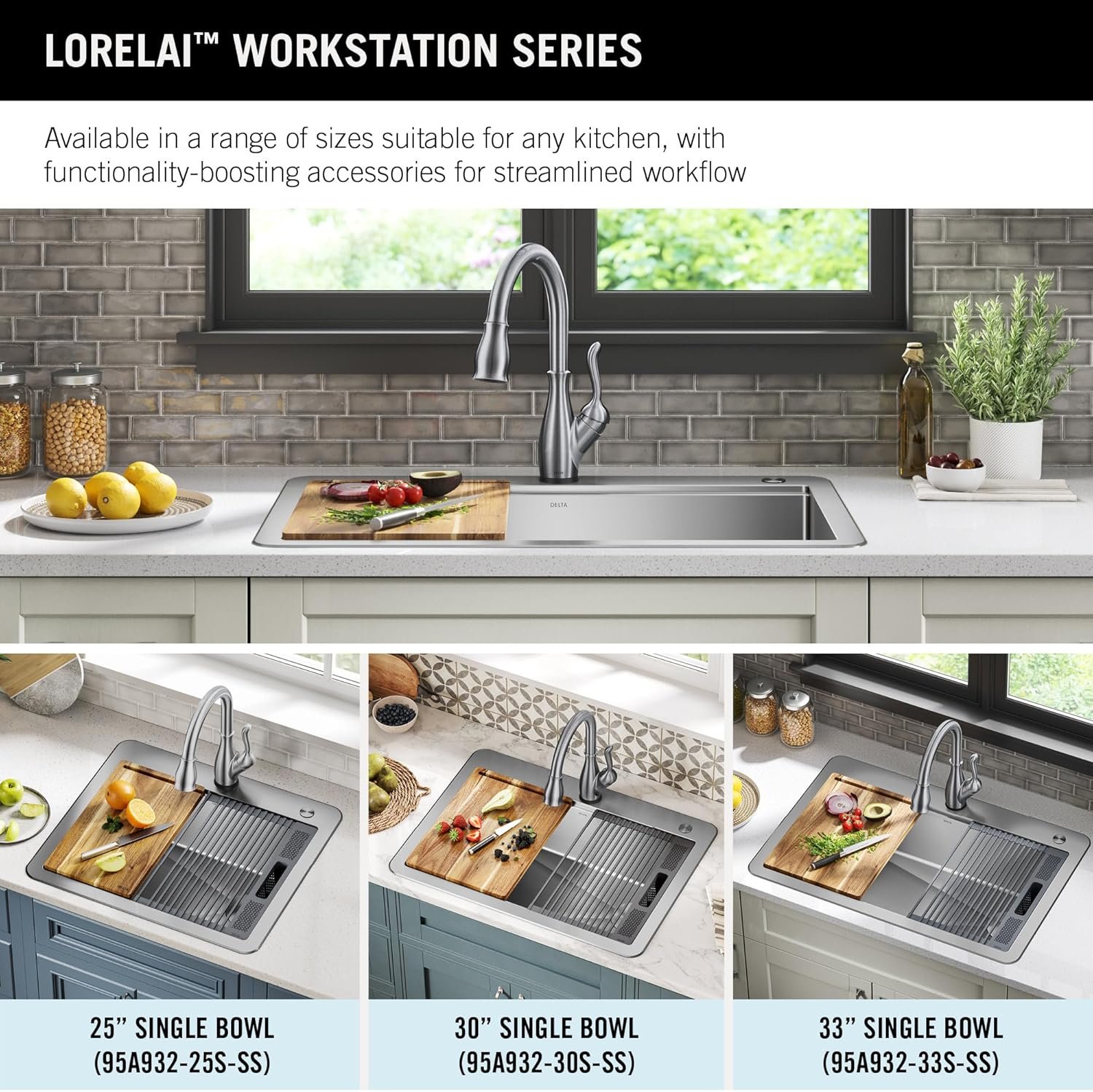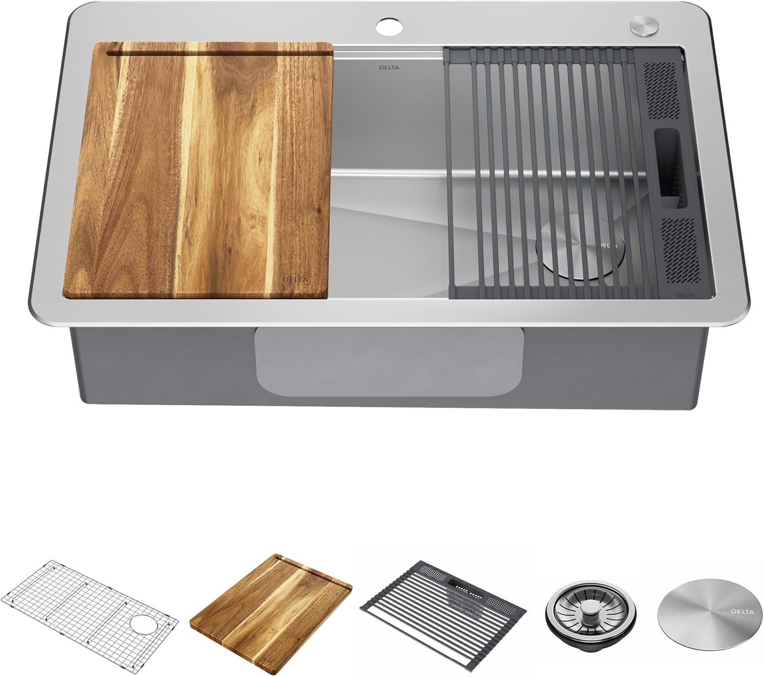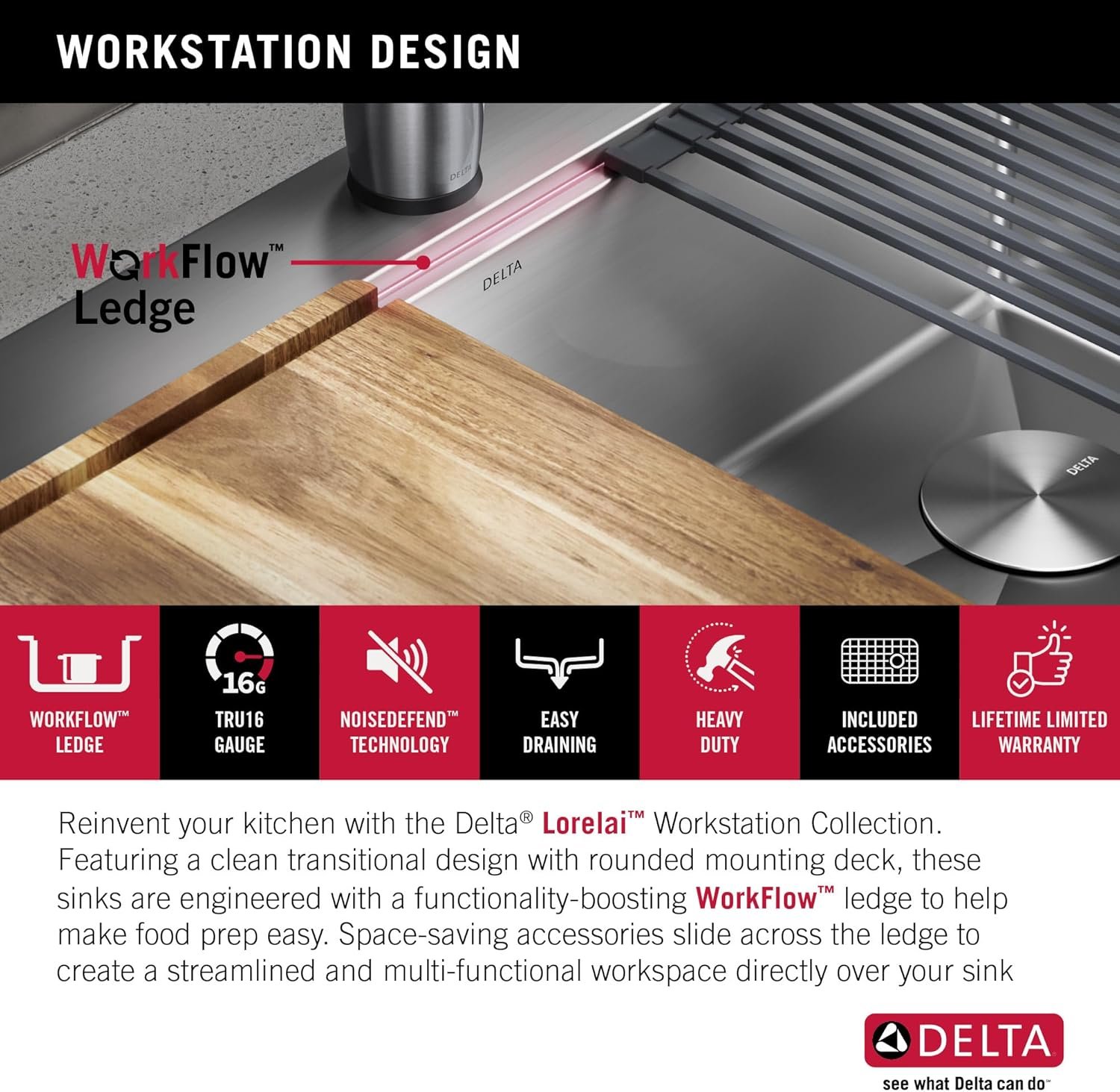 The Delta Lorelai Workstation Collection is defined by sleek lines and a gently rounded mounting deck, offering a clean transitional look that blends perfectly with any kitchen style. These sinks are designed with a built-in WorkFlow ledge that helps make food prep easy by allowing you to slide accessories across the sink, creating a multifunctional work surface for seamless transition between tasks. The kit includes a durable cutting board and roll-up dish rack with removable utensil holder that allow you to combine prepping and cleaning in one convenient location. Heavy-duty TRU16 gauge construction offers long-lasting durability so that you can use your sink with confidence. Engineered with a heavy-duty 4mm mounting deck, the drop-in sink design is easy to install with any kitchen countertop. The deep single bowl offers enough room to wash large items while containing mess and splatter inside the sink. Multi-layer NoiseDefend soundproofing reduces noise and vibration from dishes, running water, and garbage disposal. SatinSheen finish provides a smooth surface that’s easy to clean, so your sink stays beautiful with less effort. Channel grooves and a sloped bottom improve drainage, while EZClean corners reduce build-up over time. The installation-ready sink includes all mounting hardware and a stainless steel drain assembly to get your installation moving fast.
