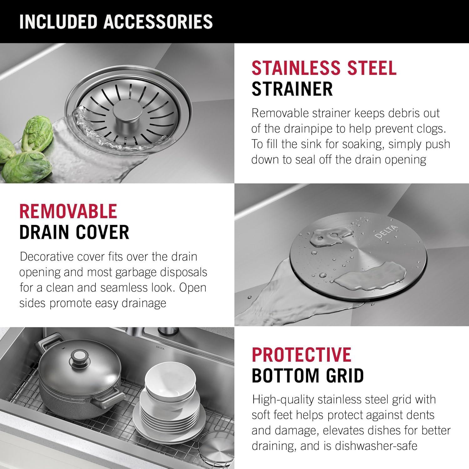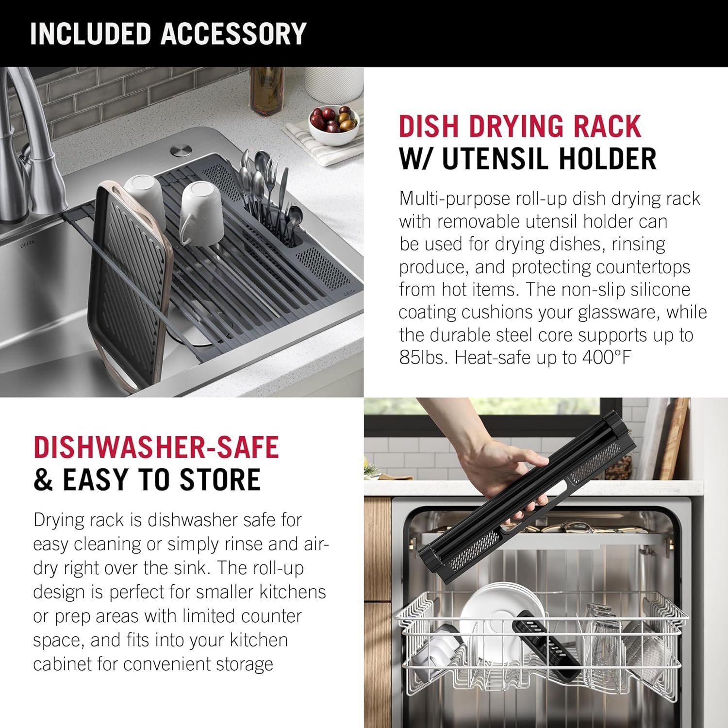 5 INCLUDED ACCESSORIES: Work over the sink on ACACIA CUTTING BOARD w/ MOBILE DEVICE HOLDER for hands-free use while cooking – Stainless steel ROLL-UP DRYING RACK w/ silicone coating and UTENSIL HOLDER is perfect for drying dishes and protecting countertops from hot items; dishwasher-safe, holds up to 85 lbs., heat-safe to 400 degrees F – STAINLESS STEEL BOTTOM GRID keeps dishes elevated and protects sink surface – STAINLESS STEEL DRAIN ASSEMBLY w/ COVER conceals drain opening and keeps drain clear, helping prevent clogs