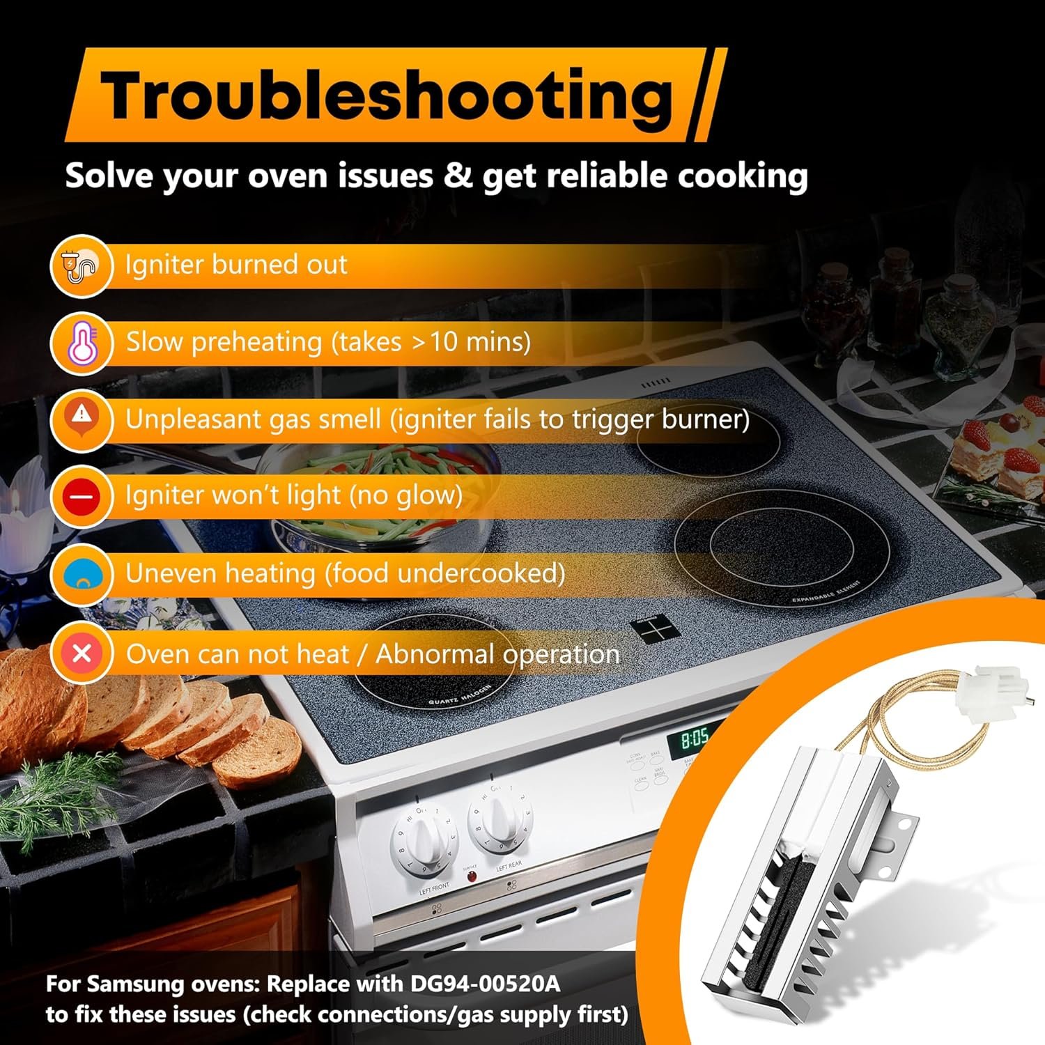 FOR GAS RANGE MODELS — Upgraded DG94-00520A Oven Igniter Replacement is Compatible with a Wide Range of Samsung Gas Range/Oven Models in the NX58, NX60 Series like NX58H5600SS, NX60A6511SS, NX58M6600SS, NX58H9500WS, NX58H5650WS, NX58J7750SS, NX60T8751SS and more. This DG94-00520A igniter is a direct fit for your Sams-ung gas range oven, ensuring perfect compatibility and easy installation.