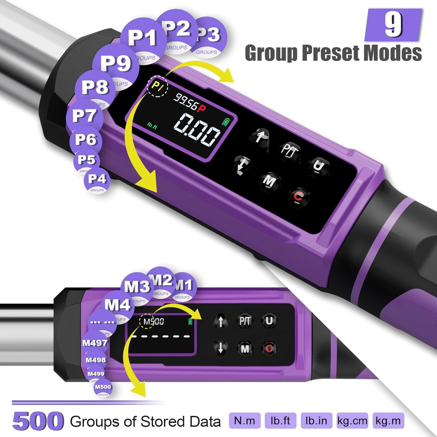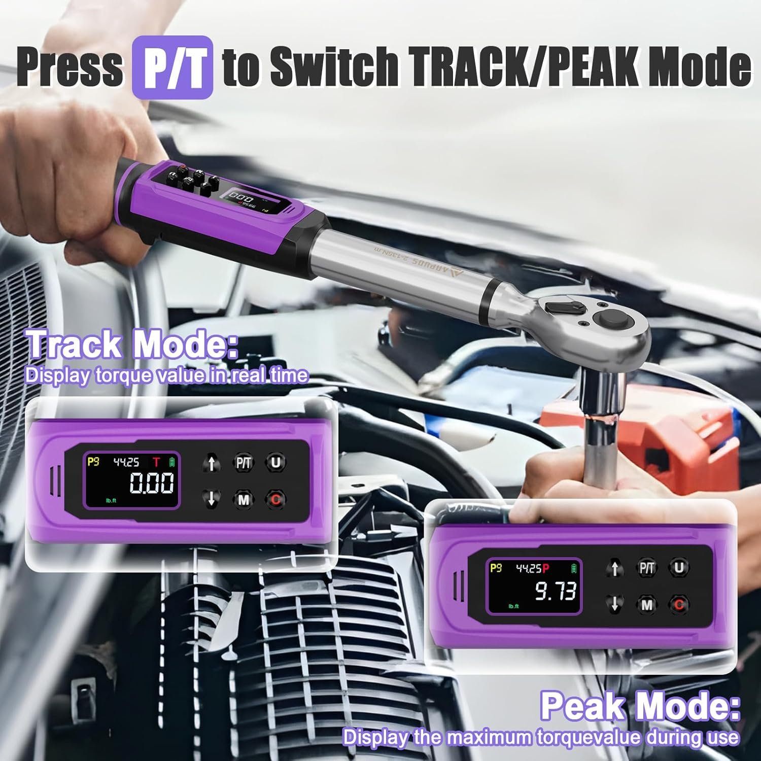 【9 Groups of Preset Values & Data Storage】This 3/8 torque wrench digital features 9 programmable preset modes (P1–P9) — save job-specific torque profiles for auto, aerospace, and bike tasks to eliminate recalibration. With 500 built-in data storage records, easily review past torque settings for quality control and audit compliance.Peak Mode locks max torque (critical bolts like engine mounts—no slip-ups!). Track Mode shows real-time tweaks (ideal for bike tuning/electronics).
