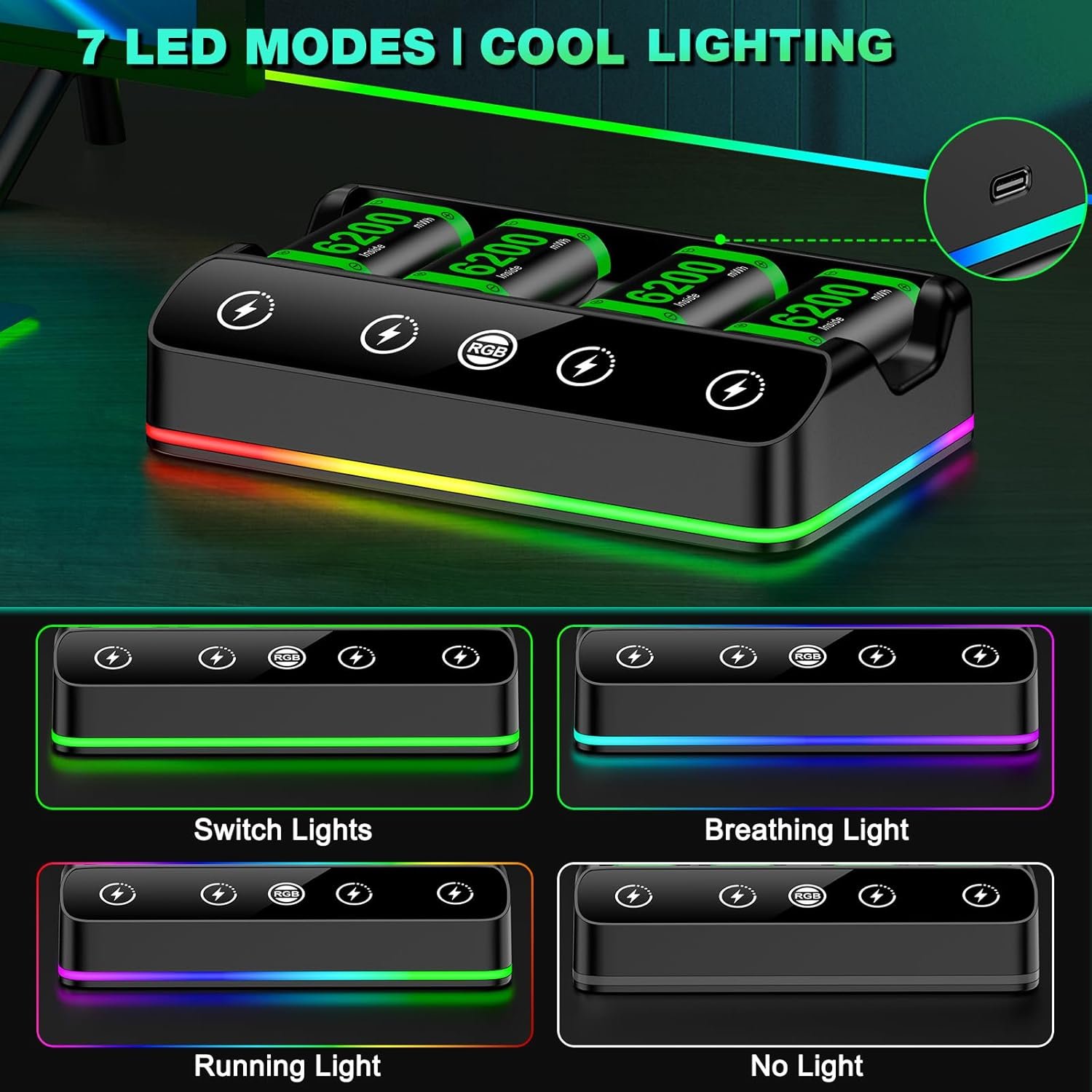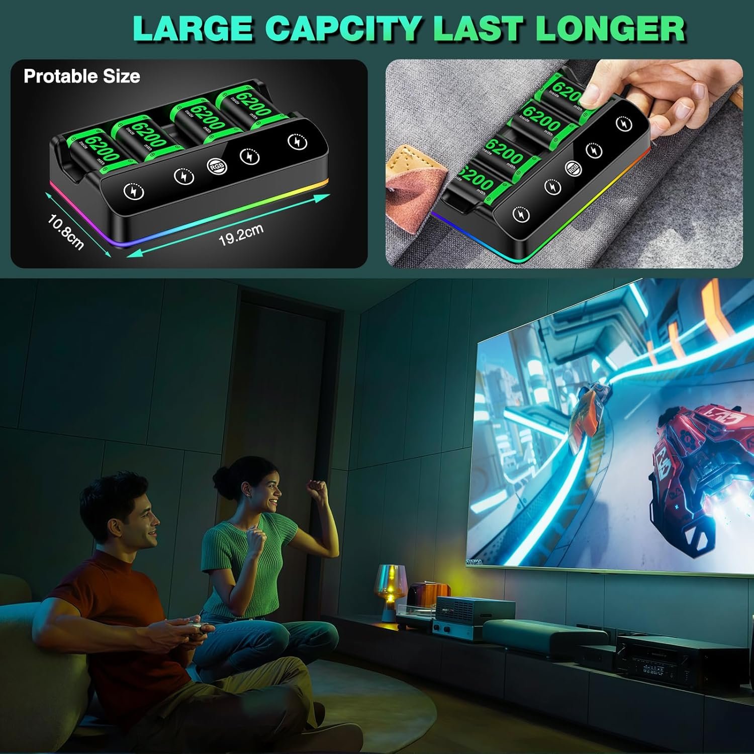 【4x 6200mWh Batteries Compatible with Xbox】This battery pack rechargeable with charging station, comes with 4x 6200mWh rechargeable batteries.The battery backup can double the gaming time, 6200mWh high capacity controller batteries allowing you or your family or friends to fully enjoy the fun of gaming without worrying about low battery affecting the game rhythm