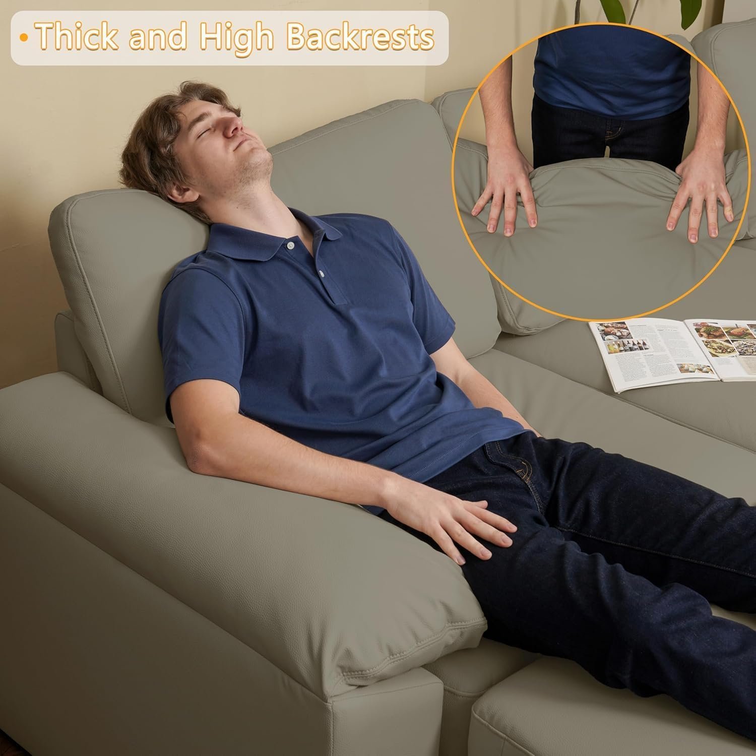 Oversized Deep Seat Sectional Sofa: Each individual seat size: 33.86 inches wide x 34.25 inches deep x 37.4 inches high, far exceeding most sofas. The backrest height is increased from the common 16.5 inches to 19.7 inches,which can more comfortably support your back and neck.The EASE MOOSE oversized Modular couch has added a larger faux leather couch and upgraded multiple functions, which will bring you a brand new sitting experience.