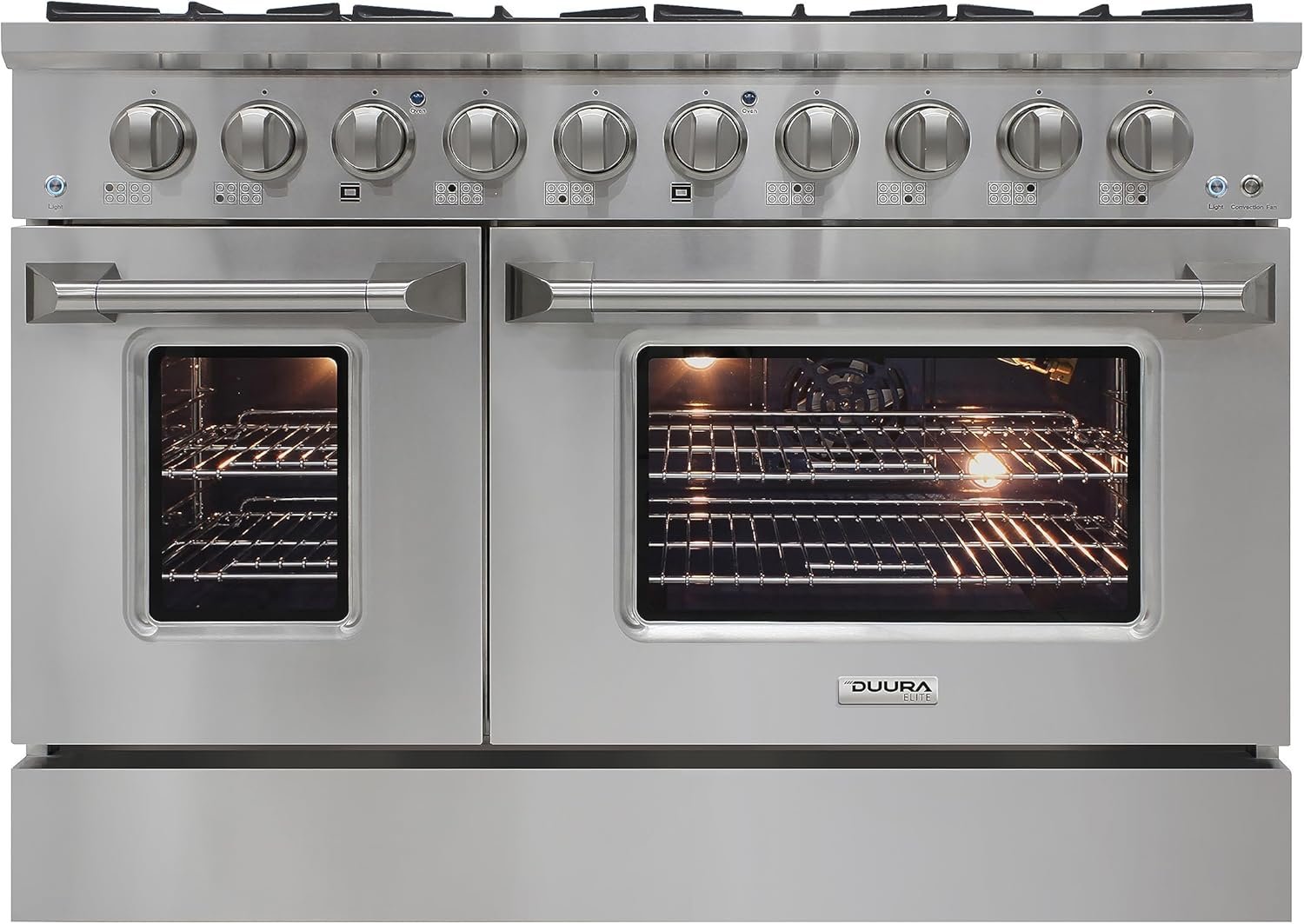 Show off your kitchen with this beautiful DUURA Elite® 48-Inch Double Oven Gas Range. The modern styling of this compact stainless gas oven will be a perfect fit for smaller spaces. Features of this unit include large knobs, dual burner, continuous grates, eight sealed burners, 3.5 and 2 cu. ft. oven capacities, blue porcelain oven, stainless steel drip pan and a sleek industrial size pole handle. The convection fan and light switches are on the sides of the control panel, and the oven indicator lights in blue signal that you left both ovens on. Designed for indoor use, this oven makes a perfect addition to any kitchen space!