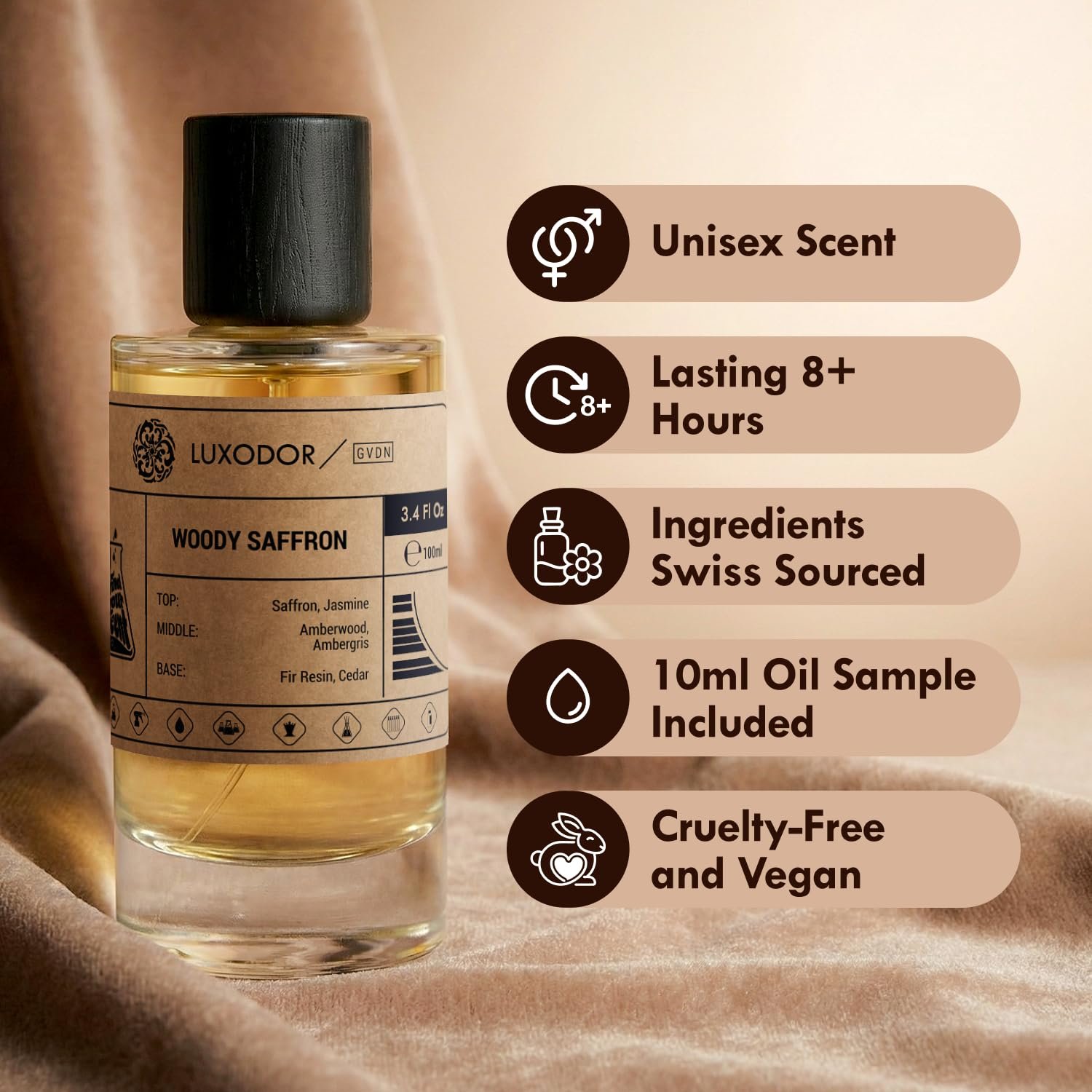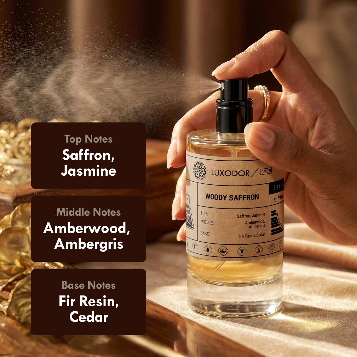 Saffron & Amber Woody Fragrance: Luxodor Woody Saffron opens with saffron and jasmine, flows into amberwood, ambergris, and hedione, and finishes with fir resin, cedar, sugar, ambroxan, and oakmoss. A rich, airy unisex perfume.
