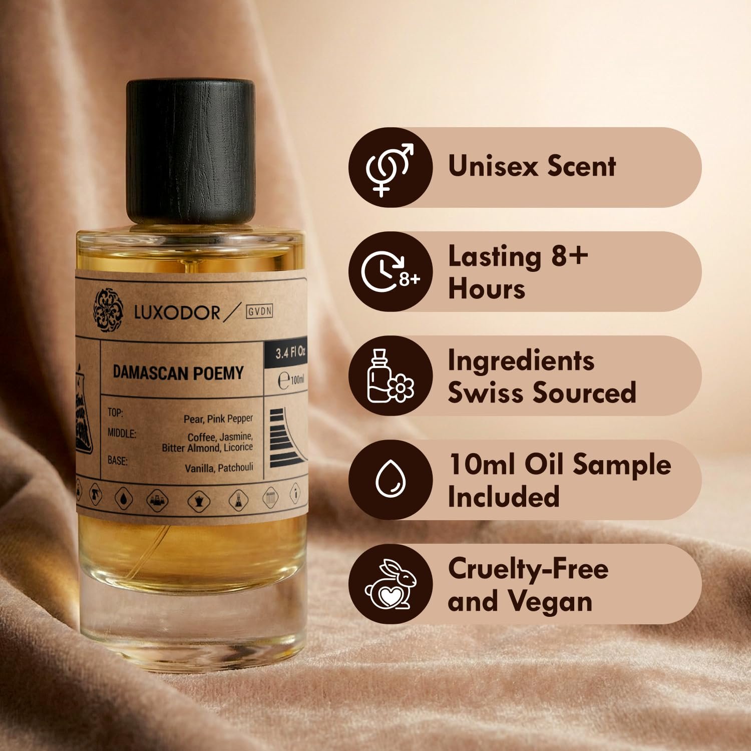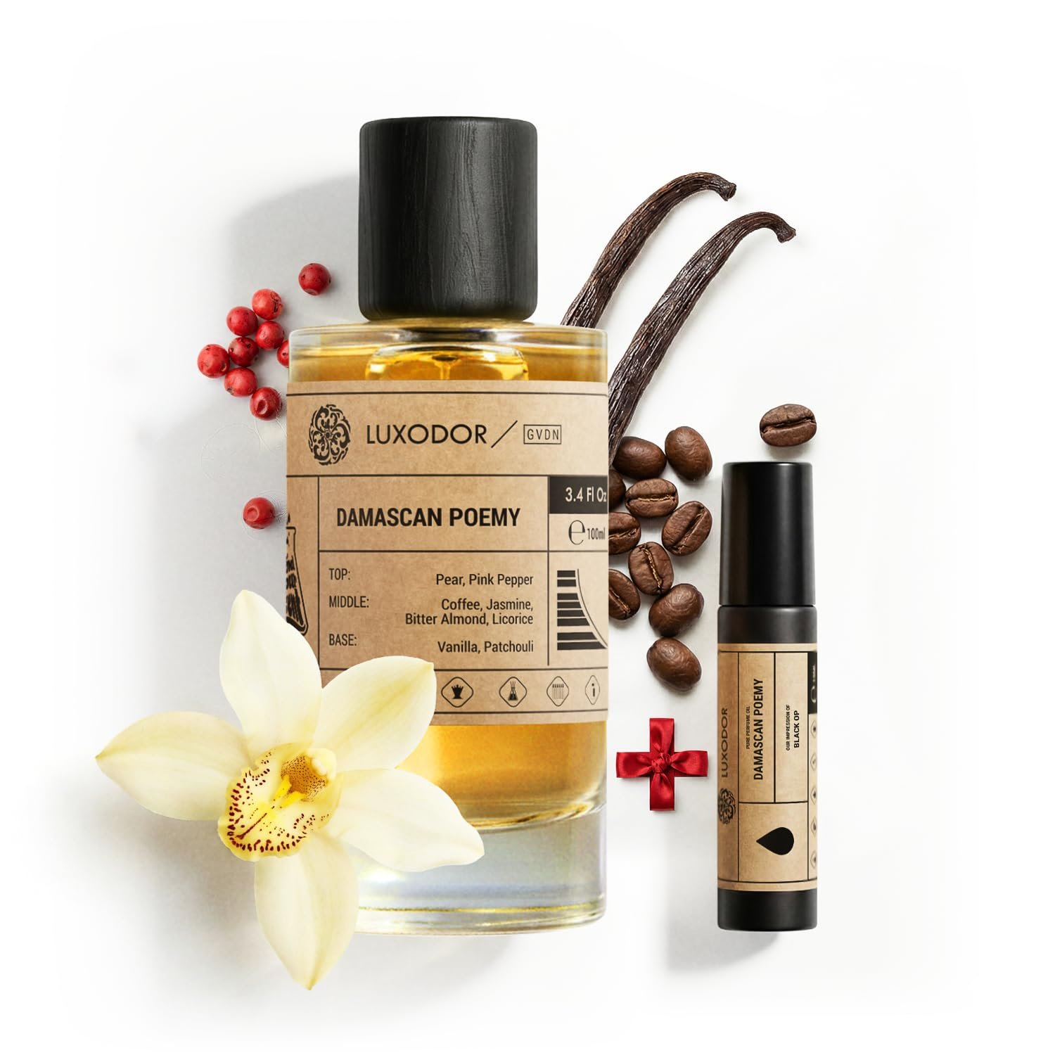 Damascus Poemy by LUXODOR is a rich women’s fragrance with top notes of pear, pink pepper & orange blossom, a heart of coffee, jasmine, almond & licorice, and a warm vanilla base with patchouli, cashmere wood & cedar.