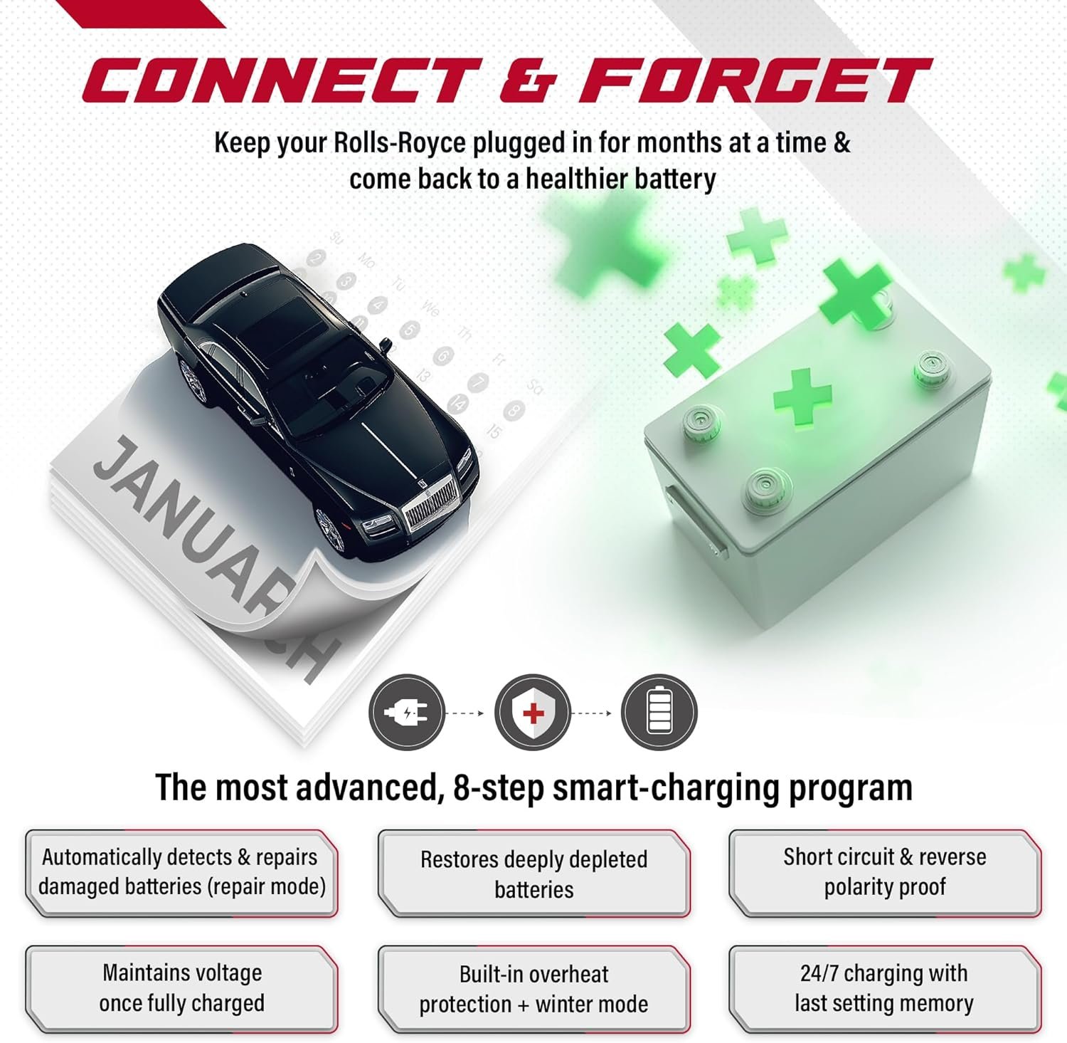 CONNECT & FORGET: Automatic 8-step smart charging program detects and repairs damaged, sulfated, or stratified batteries. Provides 24/7 trickle charging with last-setting memory. Displays real-time charging progress.