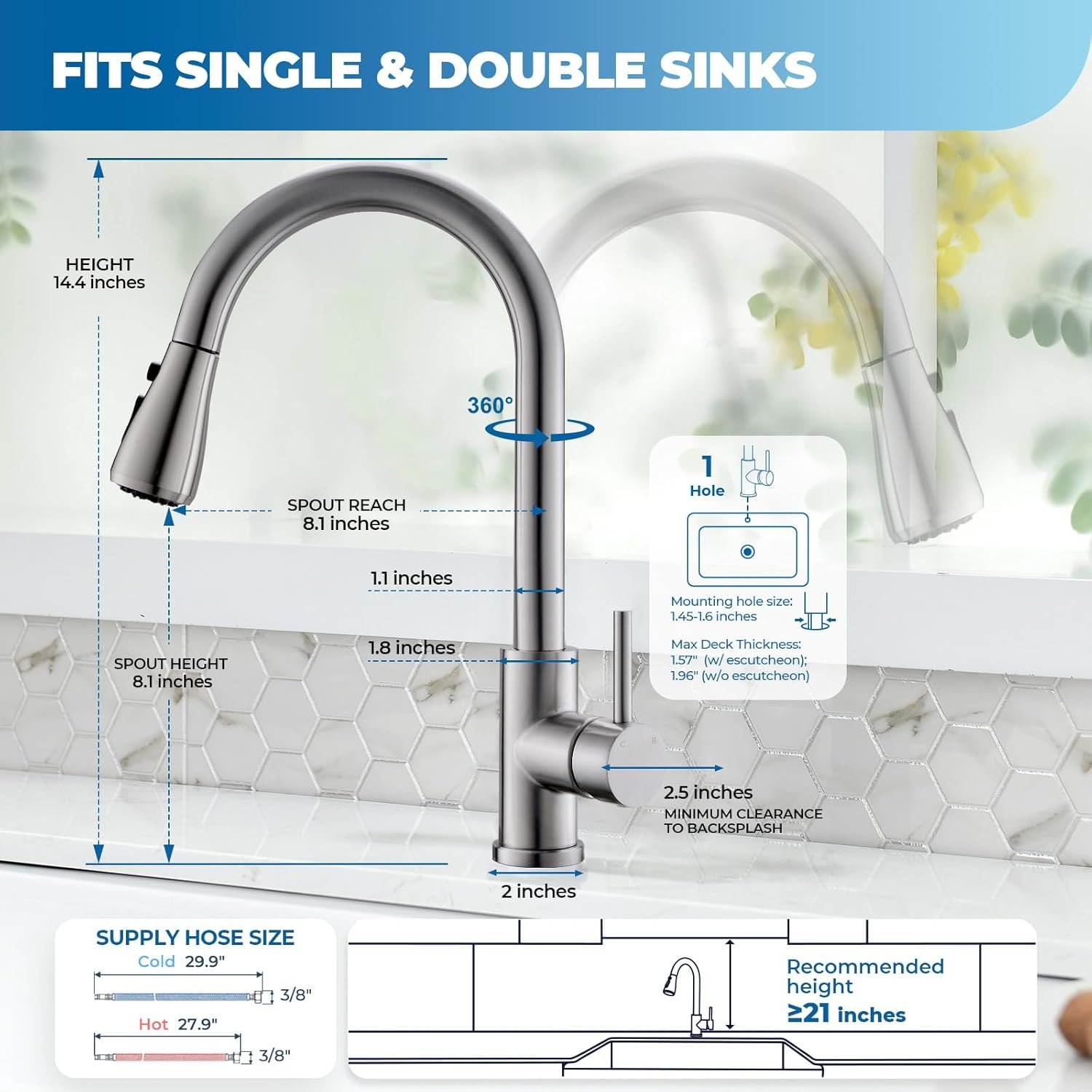 PERFECT FIT & DESIGN: With a 14.4″ high-arc spout and 360°rotation, the single hole kitchen sink faucet fits 95% of sinks. The brushed nickel kitchen faucet with sprayer’s unique safety feature delivers cold water when pulled forward, preventing scalding—ideal for the old and the young! A 1.8 GPM flow rate saves over 20% water