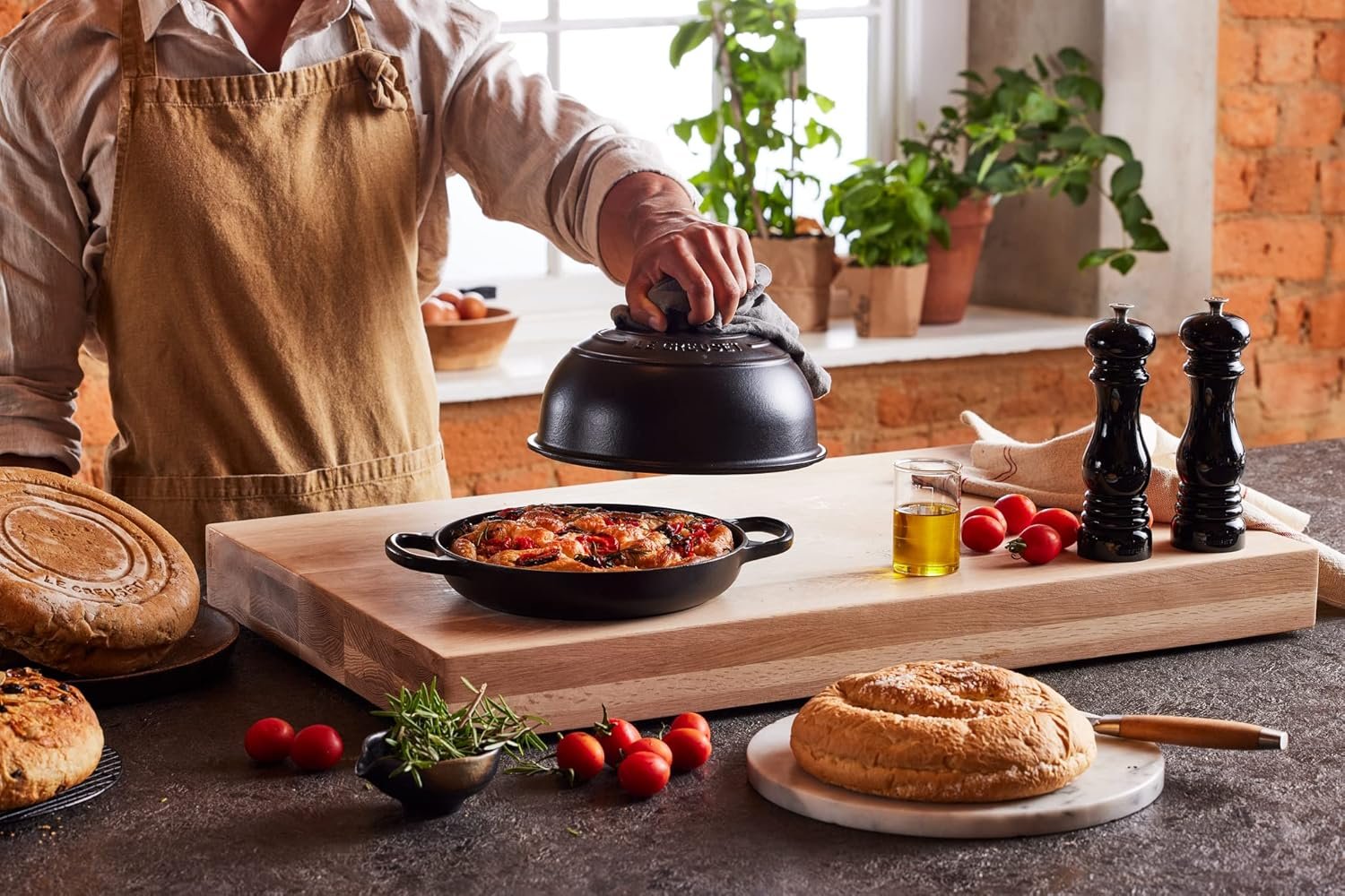 Tight-fitting domed lid is specially designed to trap and circulate steam to create a crisp crust, maximum rise and excellent flavor