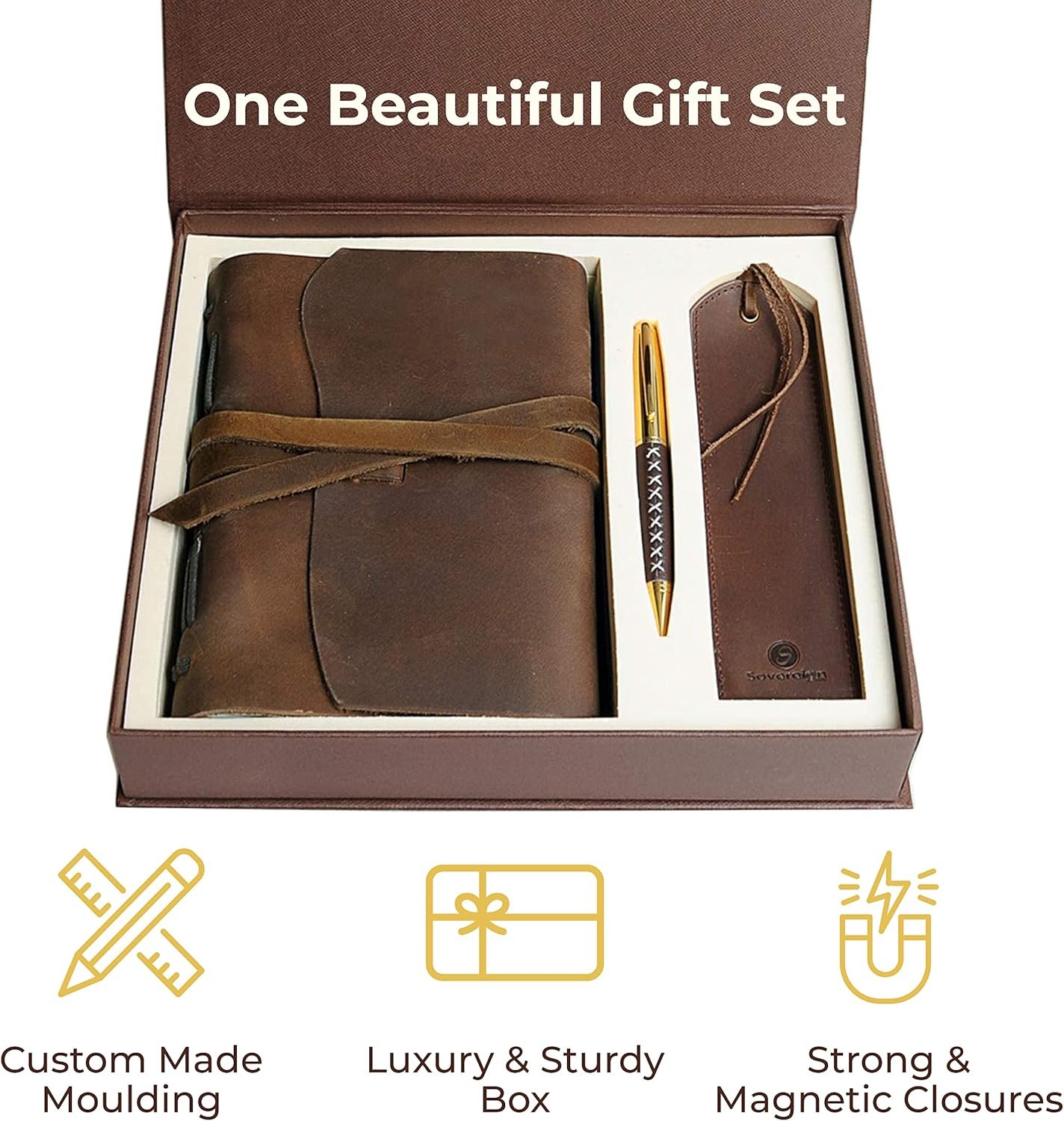 UNIQUE GIFT SET with handmade leather journal, leather bookmark, hidden pen holder & stylish pen – all in this finely crafted presentation box making it the perfect present