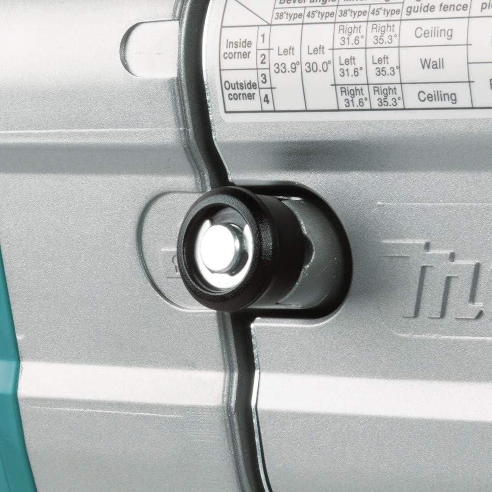 The Makita 12” dual-bevel sliding compound Miter saw with laser (model LS1219L) combines capacity, accuracy and efficient dust extraction in a more compact size, with a unique 2-steel rail sliding system that offers a reduced footprint for operation flush against a wall. The innovative direct-drive gearbox and guard system is engineered for increased vertical cutting capacity of baseboard (6-3/4”) and crown molding (8” nested). it will also make 15” crosscuts at 90 degrees. The saw miters 0° to 60° left and right, with positive stops at 0°, 15°, 22.5°, 31.6°, 45° and 60° (left or right). the bevel Lock is located in the front of the saw for easy access and Quick adjustments from 0° to 48° (left and right). the saw is powered by a 15 amp direct drive motor with soft start, a key point of difference. Direct drive enables smoother start-ups and consistent, Constant power with No belts to slip or replace. The Electric brake provides added convenience. In addition, the electronic speed control maintains Constant speed under load for smoother, higher-quality cutting. Additional features include a high-quality 60T carbide-tipped blade, and a see-through blade guard system for greater visibility of the blade and line-of-cut. The built-in laser indicates the line-of-cut whether the blade is turning or not, and offers micro-adjustments for precise “left-of-blade” or “right-of-blade” cutting. It has dual dust Collection ports for improved dust Collection capability for use with a bag (included) or vacuum (sold separately). it also has a large-sized aluminum base that improves the stability of cutting stock for more efficient cutting.