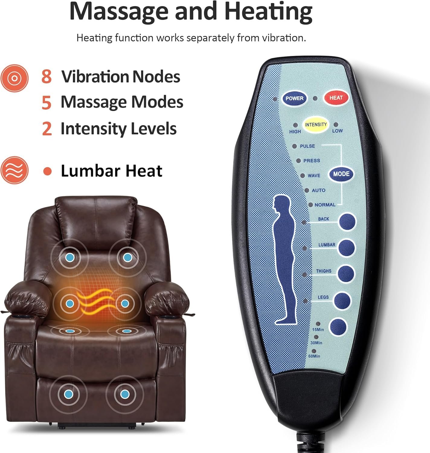 Fantastic Life Recliner! I purchased this for my father for after his hip surgery and it is the best purchase we could have made! It lifts him up to where he can stand with his walker and then reclines back enough to lift up his legs for circulation. He can sleep on it, as well. It's so comfortable, the entire family loves it. The heat is nice, but the massage part is only vibration, but the chair as a whole is worth the investment.