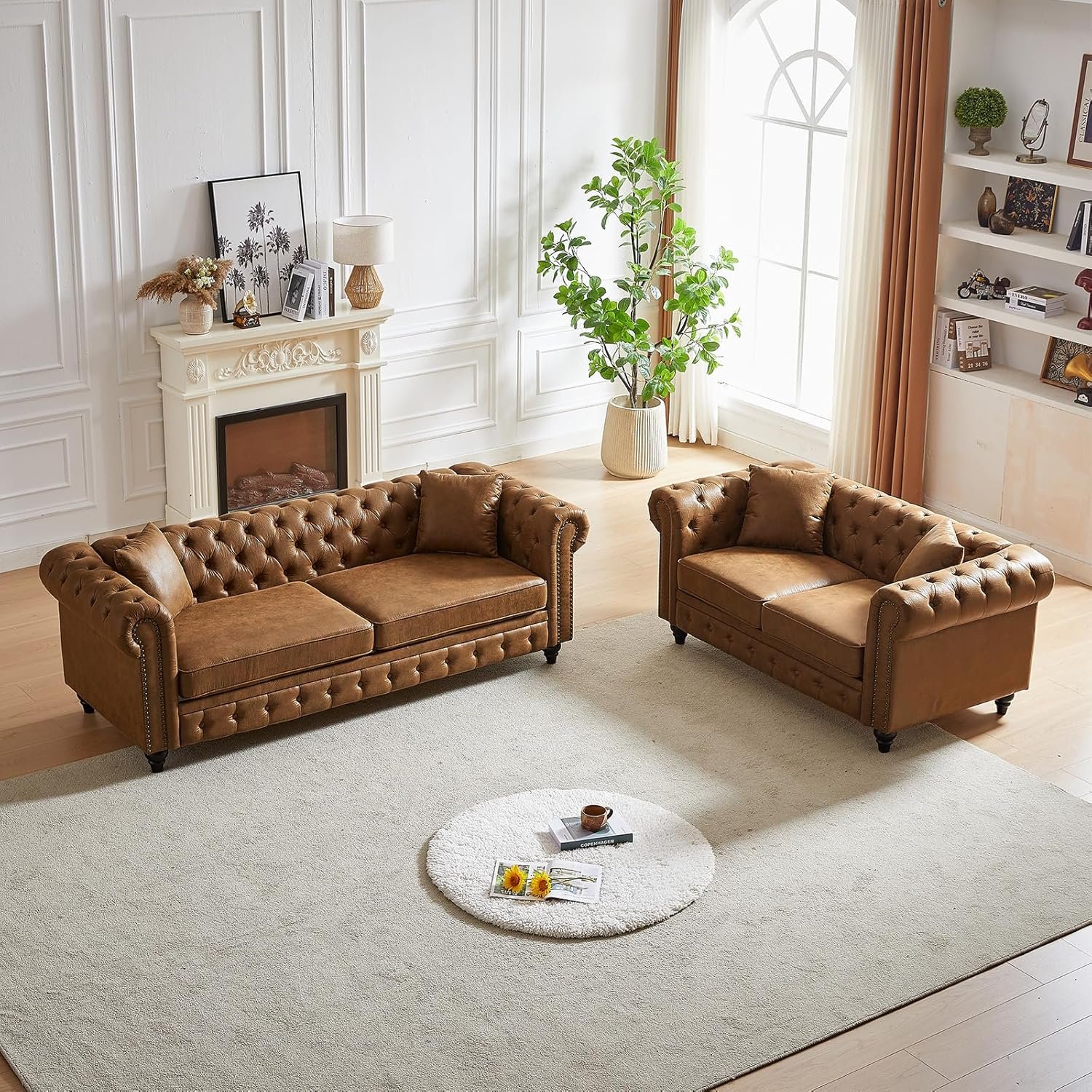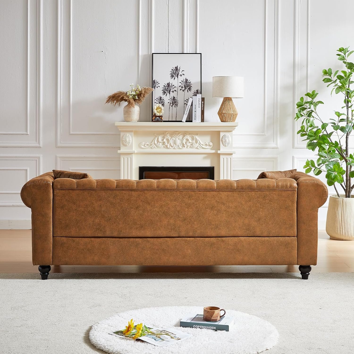 8 reviews for Modern Chesterfield Sofa Couch, 85.5-inch Faux Leather 3-Seater Sofa with Rolled Arms and Tufted Button for Living Room, Office, Brown