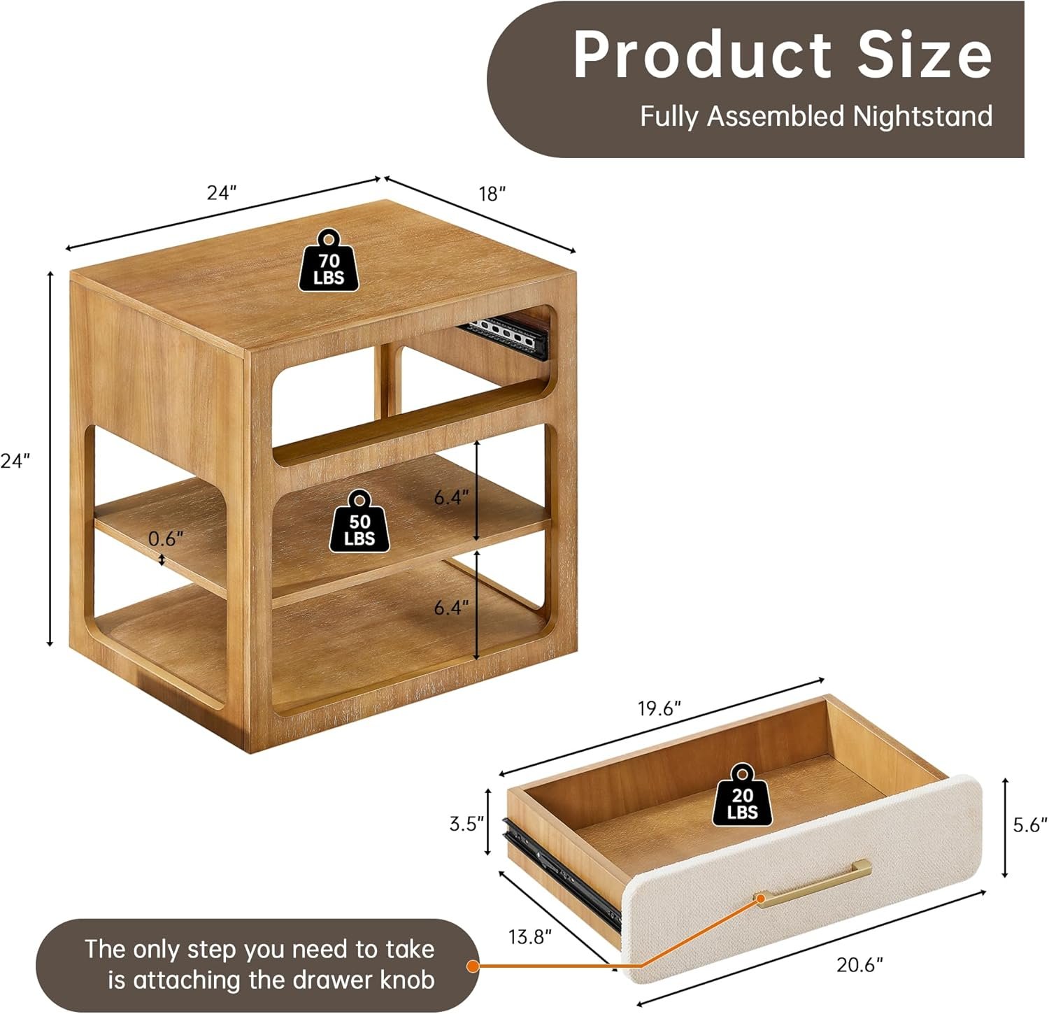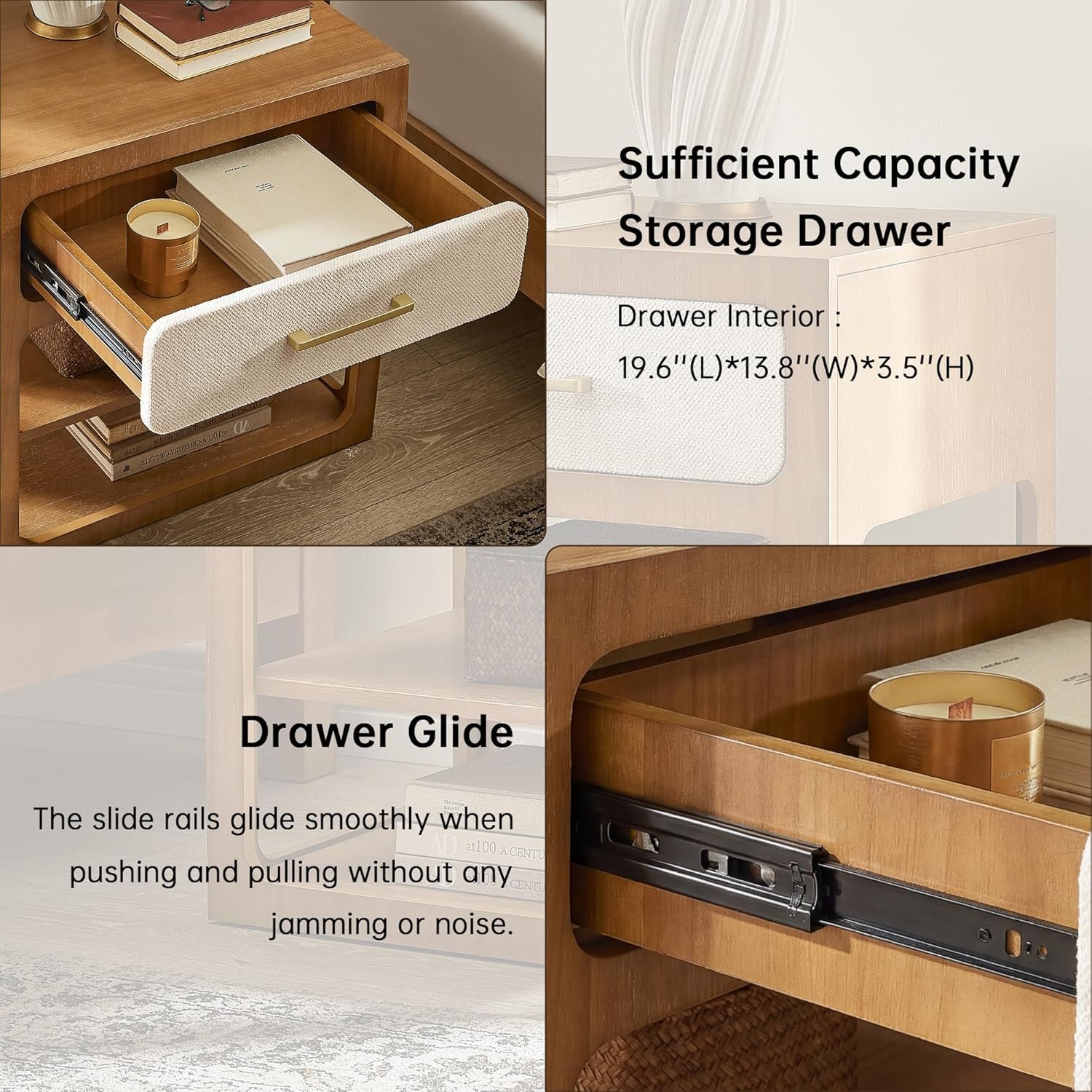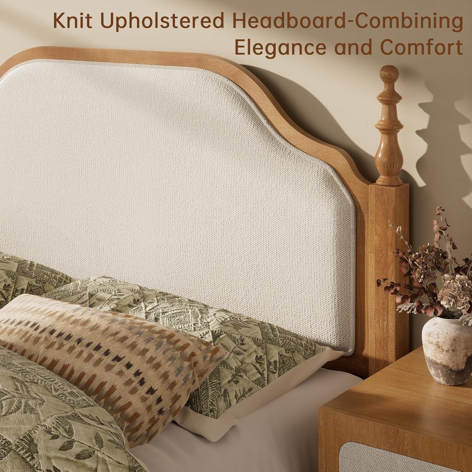 Elegant Combination of Solid Wood & Knit Upholstered Headboard:Features a solid wood bed frame with a plush, knit upholstered headboard for comfort. The matching nightstand includes a fabric-lined drawer, adding a coordinated touch of warmth and sophistication to your bedroom.