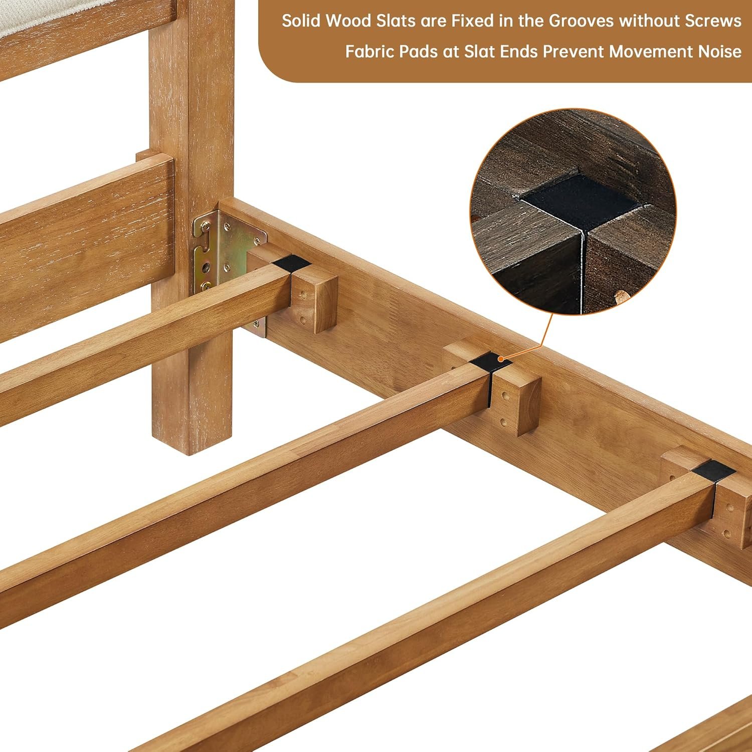 Quiet, Stable Support & Enhanced Durability : Features a genuine solid wood slat system secured in grooves (more durable than stapled or screw-fixed alternatives). Fabric pads at slat ends prevent movement noise. Provide a quiet environment for your sleep.