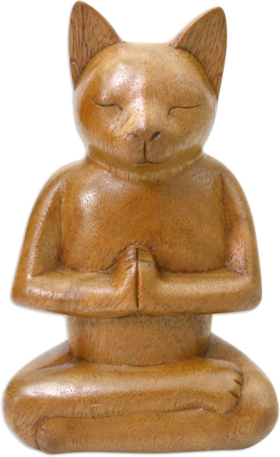 NOVICA Brown Animal Themed Suar Wood Sculpture, 6.5″ Tall ‘Cat in Deep Meditation’