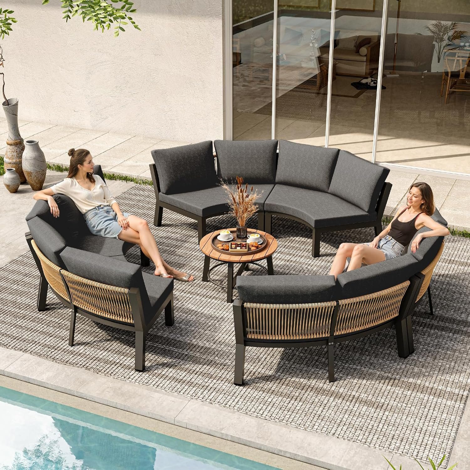 This half moon outdoor sectional furniture set completely transformed our backyard! We had been searching for outdoor furniture for several months -When I saw the curved sofa set , I knew we found it .The elegant half moon outdoor sectional is so eye catching.We placed on our newly built vinyl deck, and it immediately became the centerpiece of our outdoor space.Every time friends come over , they couldn’t help to take photos.Whether placed on porch , by the pool,or even on the lawn,it will look stunning anywhere as a modern patio set .The hand woven PE rope used in the curved back is not only beautiful but incredibly durable.You can tell it is high quality-tightly woven, nothing like cheap plastic cords you often see.It hold up perfectly to the weather.Paired with those sleek graphite colored cushions,the whole aluminum set looks sophisticated and expensive.The graphite cushions are not only stylish but practical-they hide stains well and still feel soft and supportiveThe aluminum flame structure of this patio set. It’s very sturdy .As everyone knows, aluminum is the material of choice for outdoor use due to its excellent low bearing capacity, structure stability , corrosion resistance, and rust proof properties.What please me most is that less outdoor patio furniture set it may entirely of aluminum, which means I can enjoy it years to come .The cost performance ratiois extremely high. This conversation, Patio Furniture truly combines beauty and durability-it’s designed for every day livingIt’s high end, multi functional, and incredible value for this level of quality. I am so glad we took the bold step-this modern patio furniture set is the best upgrade for our outdoor space.