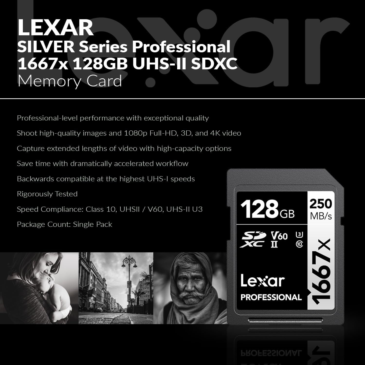 PROFESSIONAL-GRADE MEMORY CARD: Unleash professional performance with the Lexar SILVER Series 128GB UHS-II SDXC Memory Card; ideal for Digital Cameras; accelerated workflows and rigorous testing.