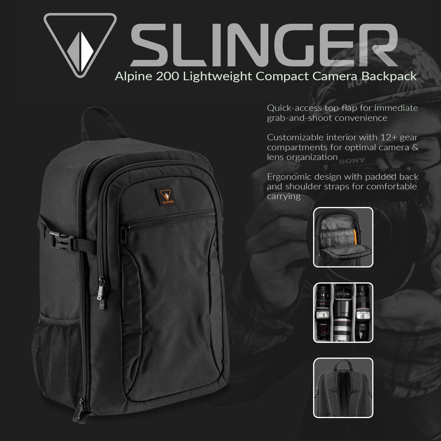 CAMERA BACKPACK PRECISION: Perfect blend of form and function with the Slinger Alpine 200 Lightweight Compact Camera Backpack; meticulously designed for Sony Alpha a7R V Mirrorless Camera.
