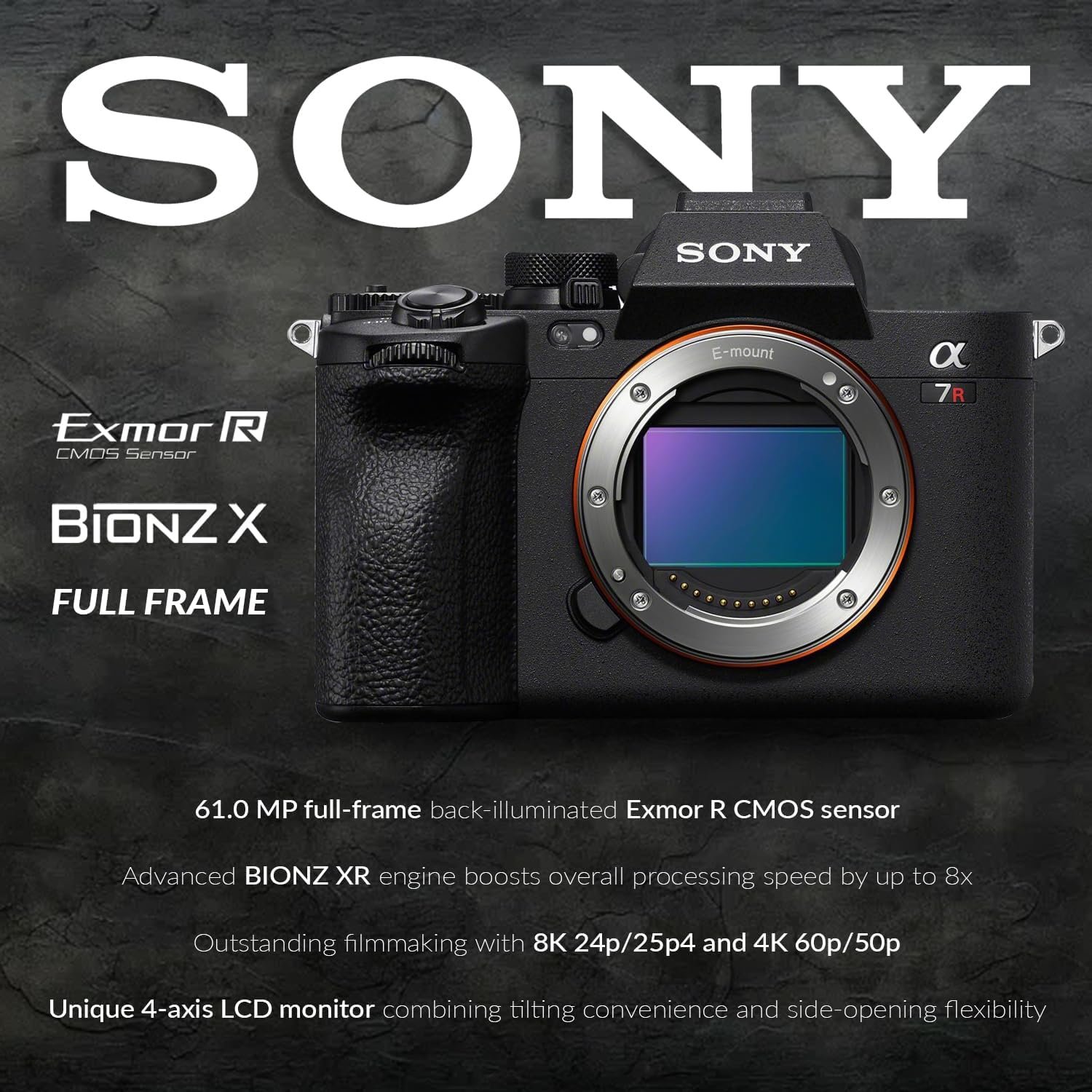 Alpha a7R V an AI Real-time Recognition AF, 61MP quality, 8K/4K video, enhanced subject recognition, exceptional autofocus, and a 4-axis LCD monitor.
