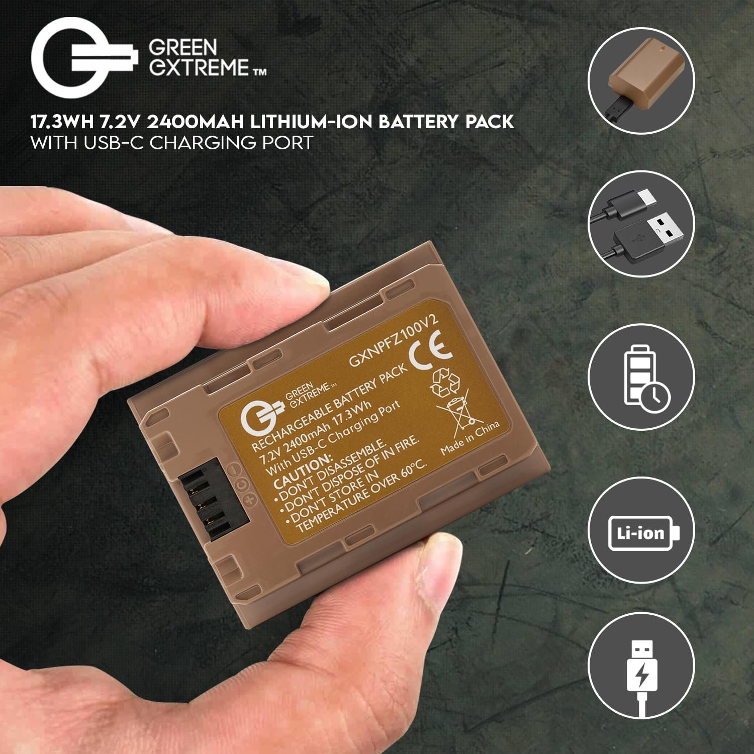 Green Extreme NP-FZ100 17.3Wh 7.2V 2400mAh Lithium-Ion Battery Pack with USB-C Charging Port