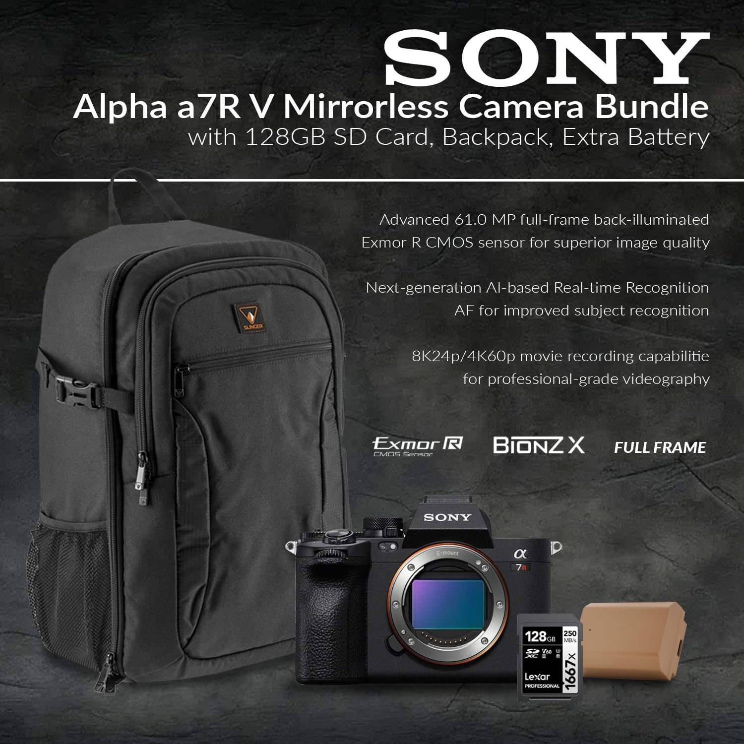 Bundle includes: Alpha 7R V Camera, 128GB SD Card, Backpack, Extra Battery