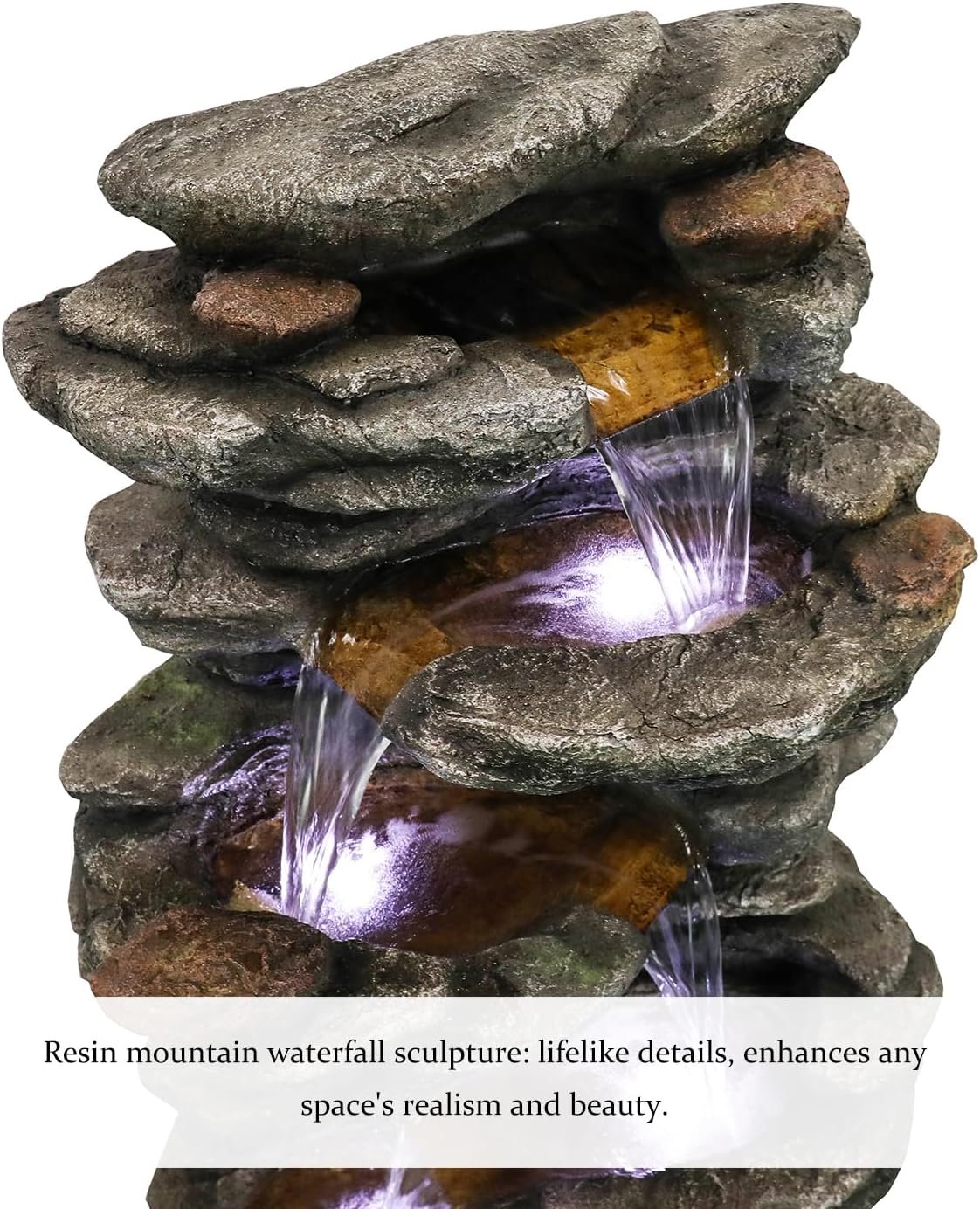 Weather Resistant waterfall fountain outdoor :Crafted from resin with a stone rock look, our outdoor garden water fountain is weatherproof, rust-resistant, and resilient. Enjoy a rich artistic touch in your outdoor space.