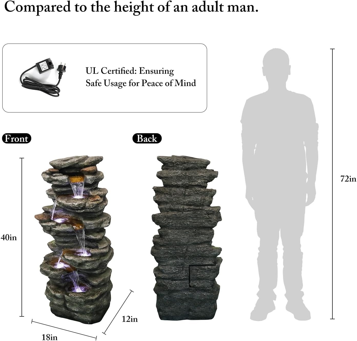 Perfect Size: outdoor fountains With dimensions of 18″L x 12″W x 40″H, this water fountain is ideal for any outdoor setting. Plus, it comes with a 1-year manufacturer’s warranty from the date of purchase.