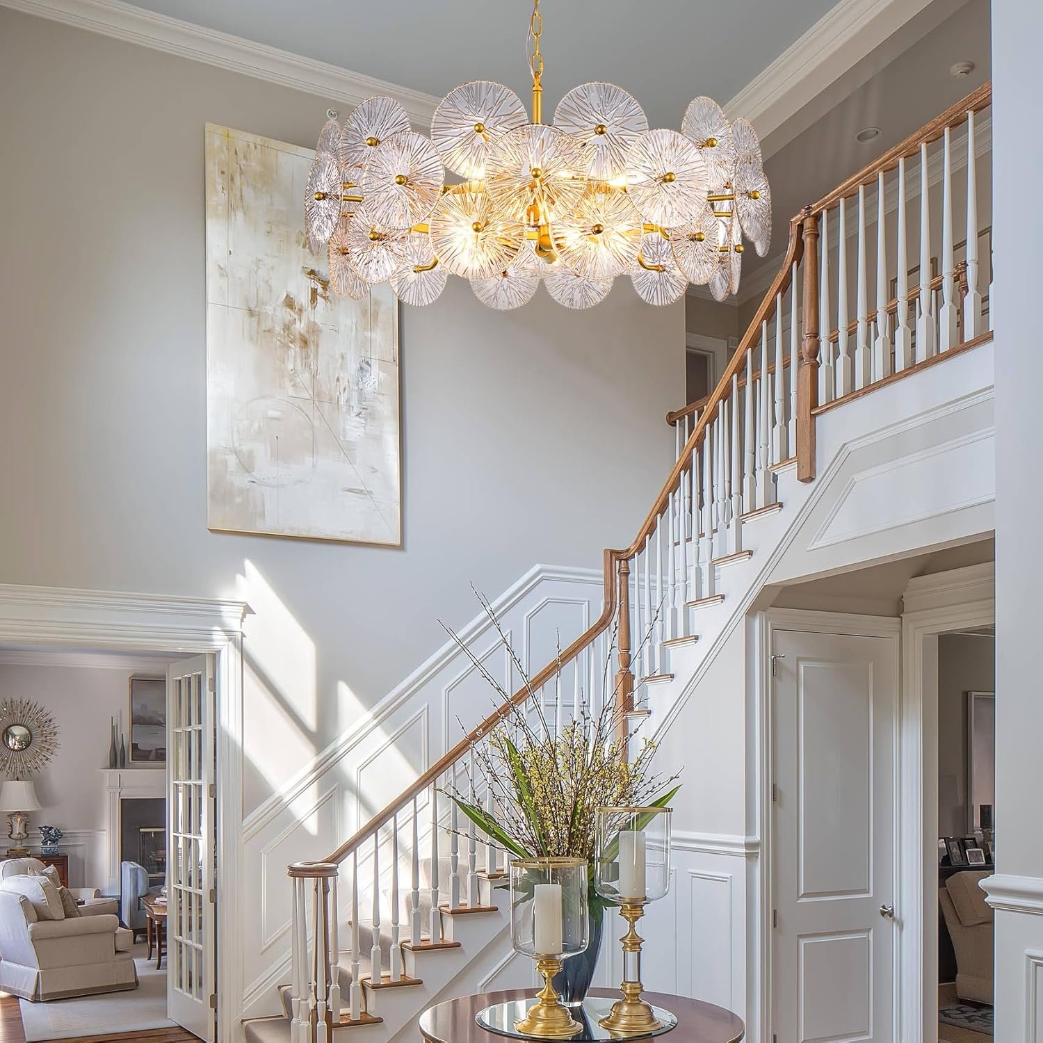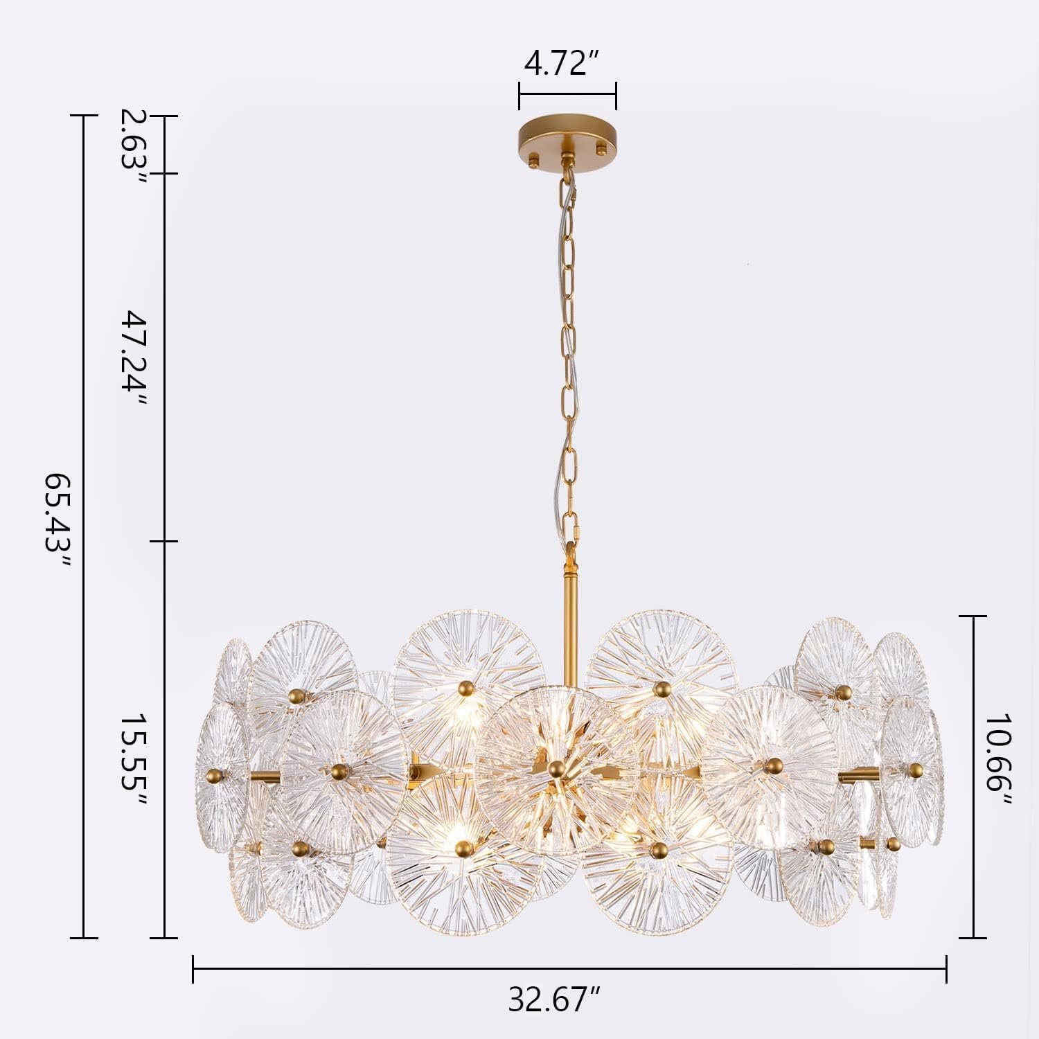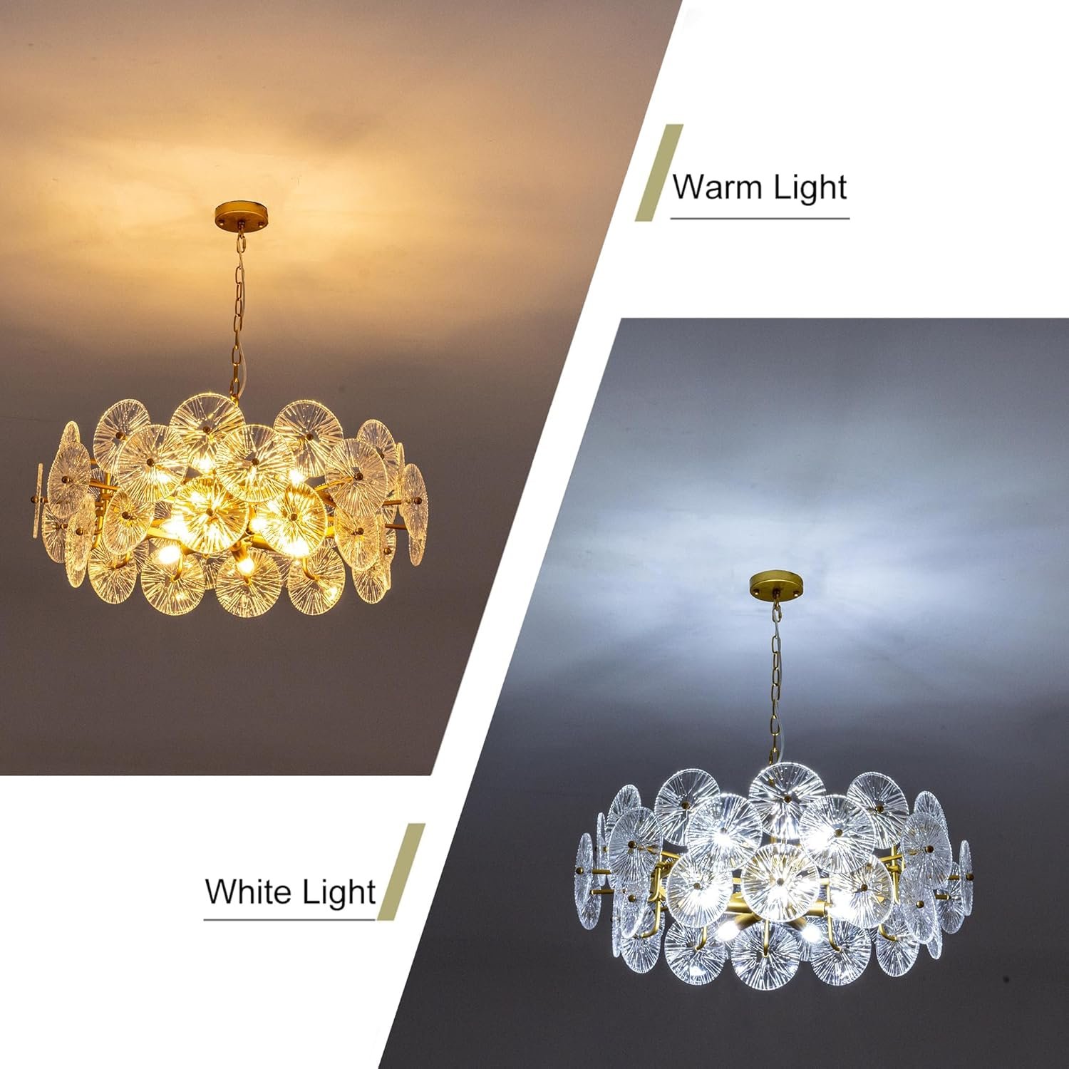 Modern Glass Chandelier: This large round chandelier is designed in gold metal ring and unique premium glass surface with fine texture, adding to the decorative effect, showcase the glamour and modern elegance of your foyer and bring comfortable and pleasing to your room