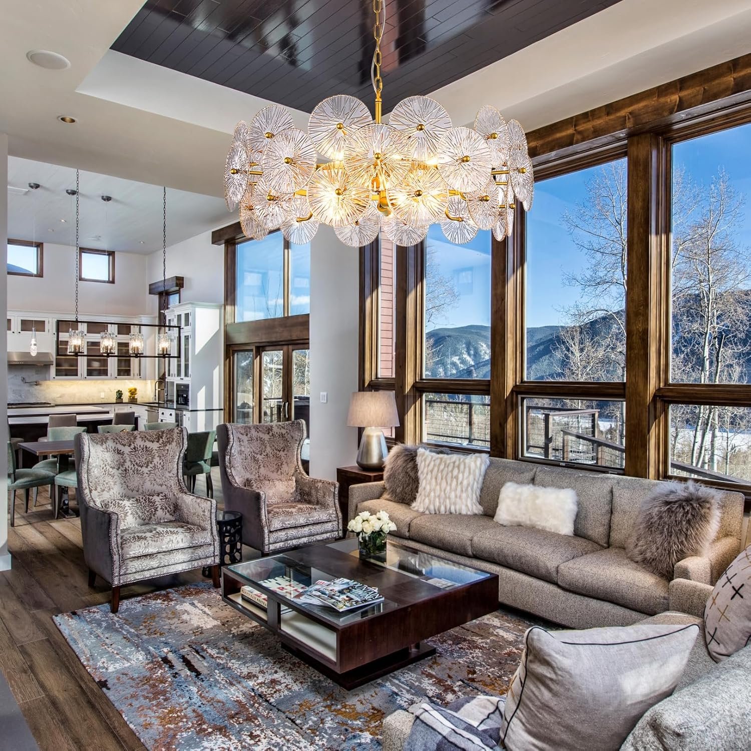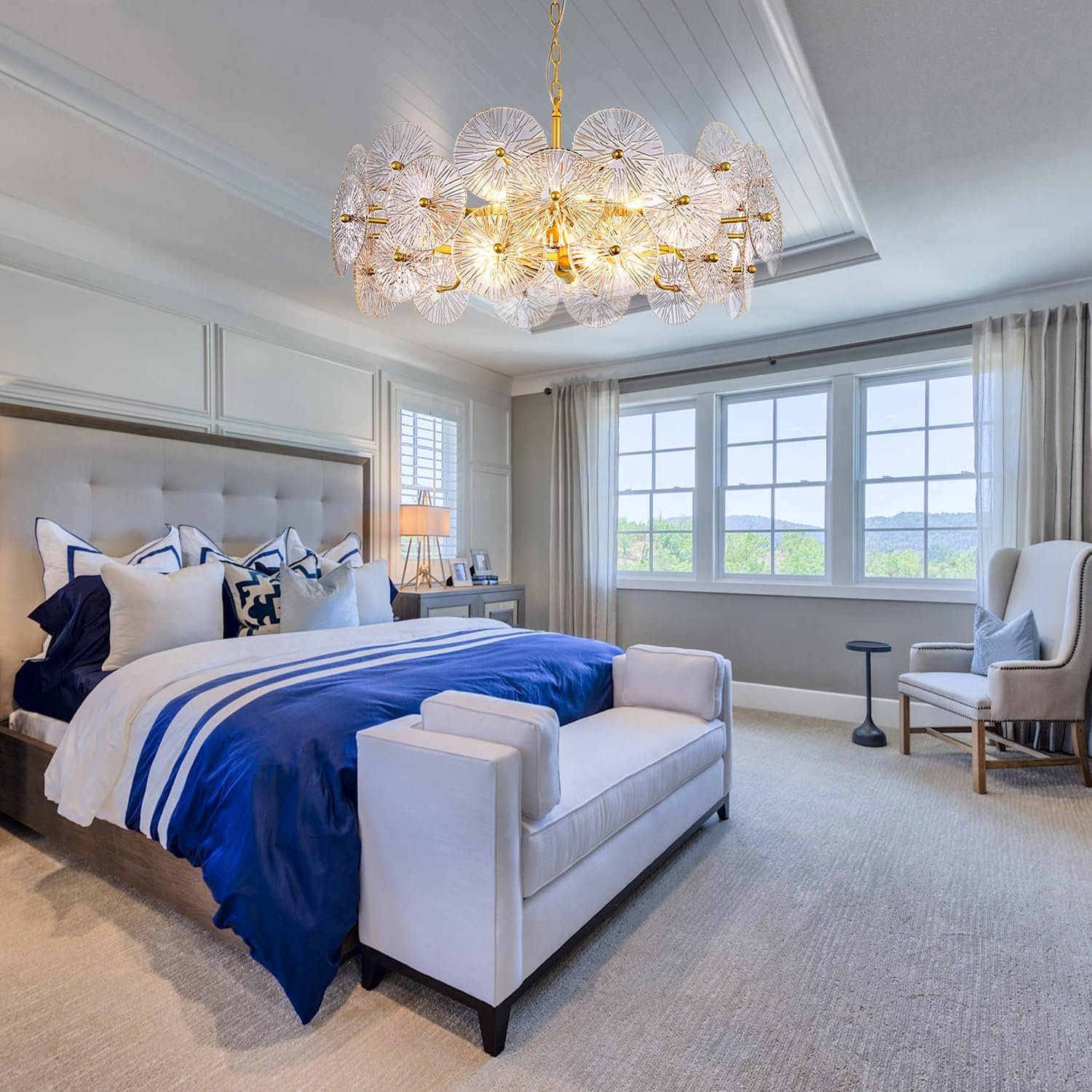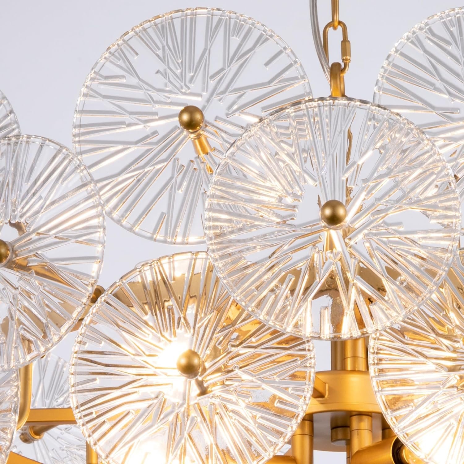 Modern Glass Chandelier: This large round chandelier is designed in gold metal ring and unique premium glass surface with fine texture, adding to the decorative effect, showcase the glamour and modern elegance of your foyer and bring comfortable and pleasing to your room